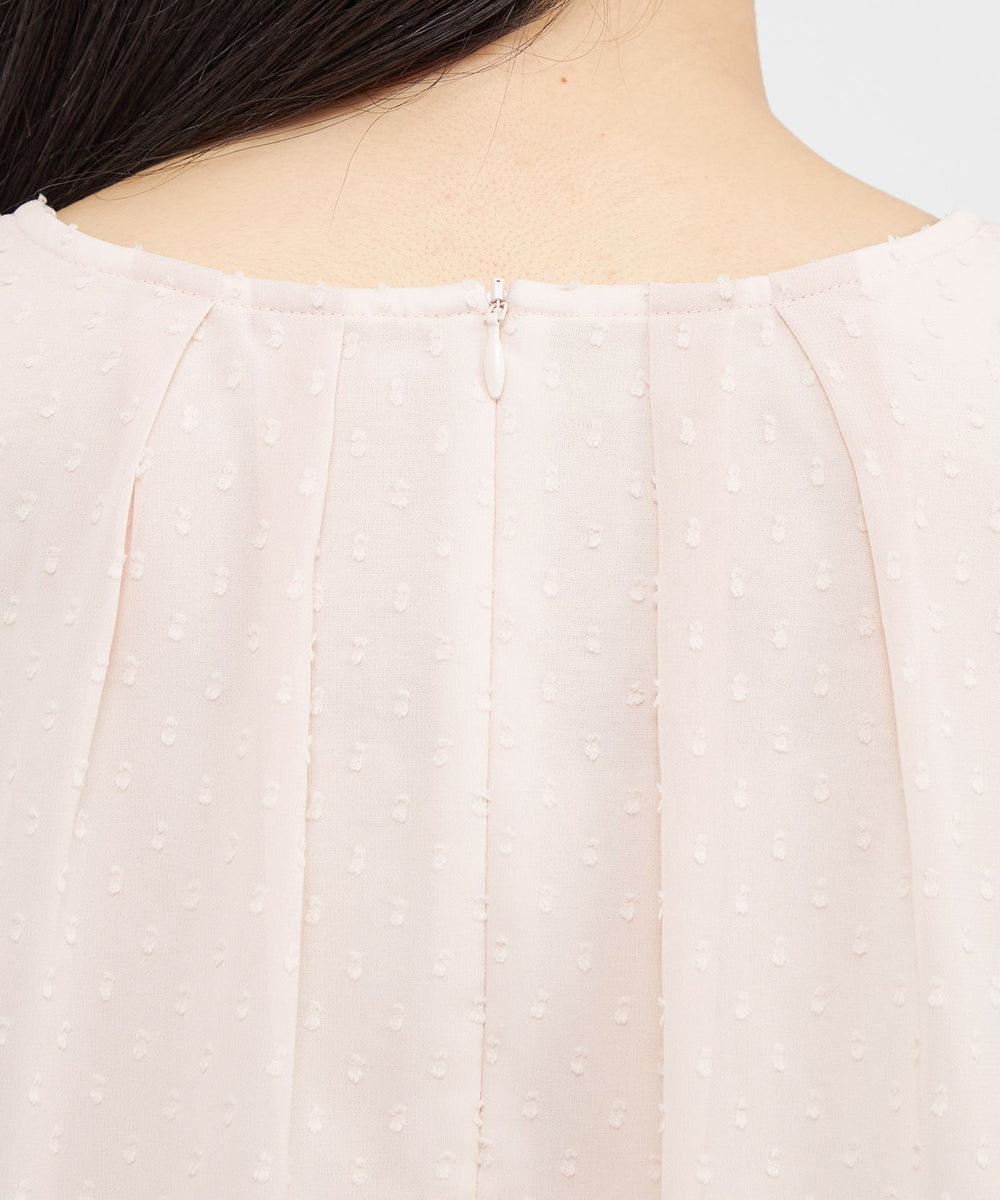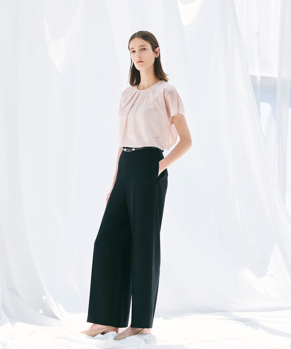 襟はクルーネックですっきりとさせつつ、タックデザインを施しポイントを付けています。