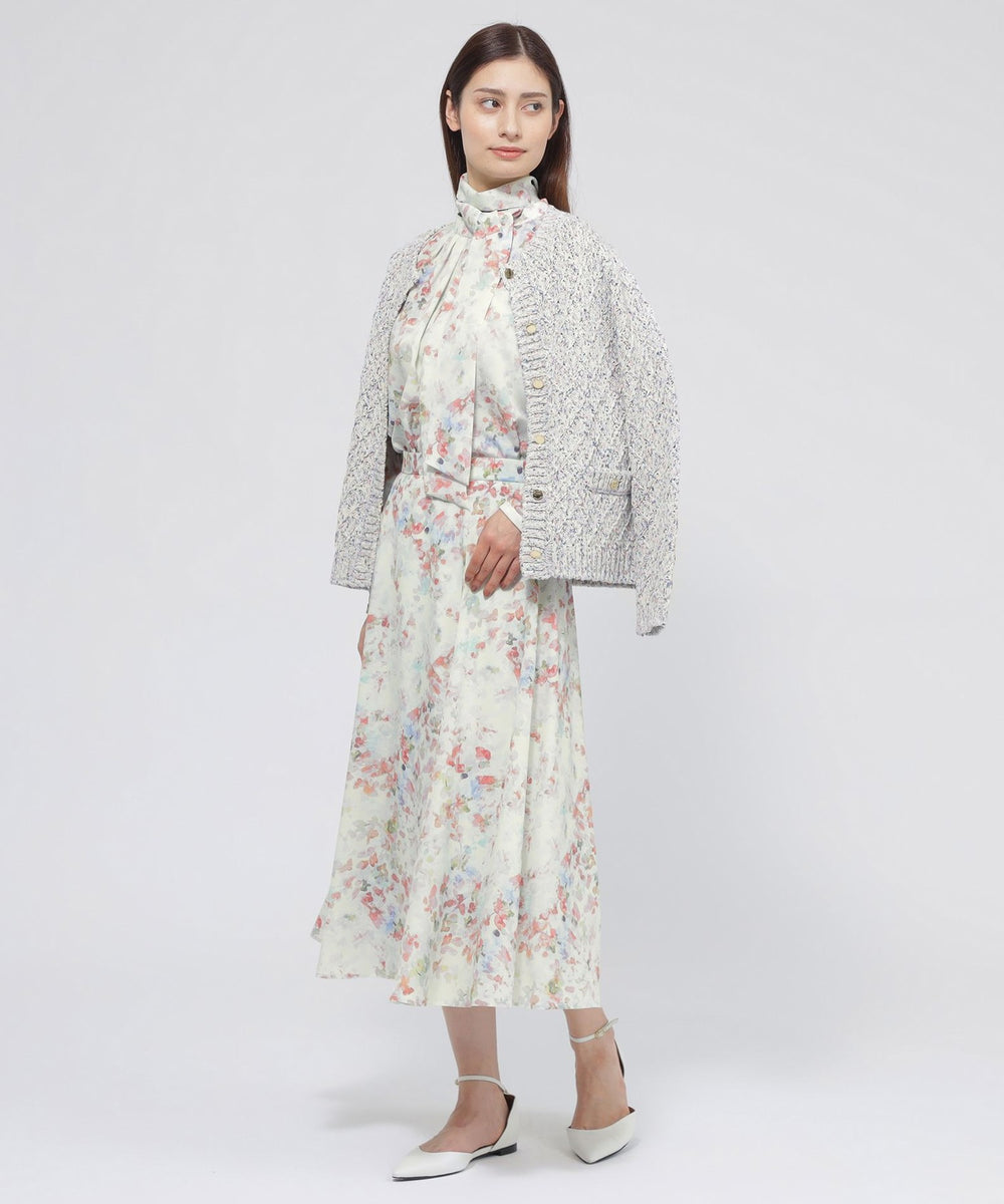 同素材のスカート(K1S12707)とのセットアップスタイルはワンピース見えするエレガントな着こなしができます。