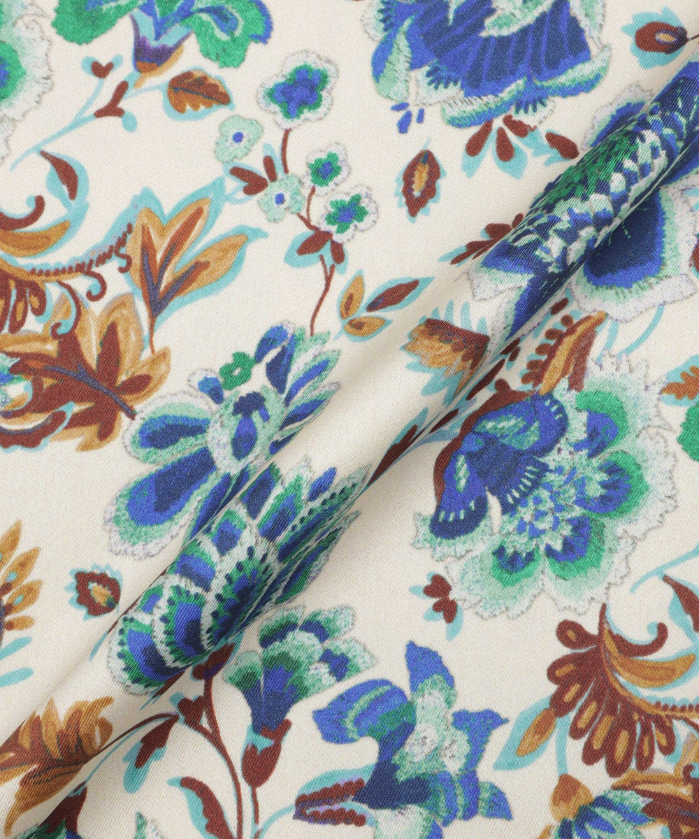 ブルーとブラウンの配色が印象的なサラサ柄をプリントした華やかな素材です。