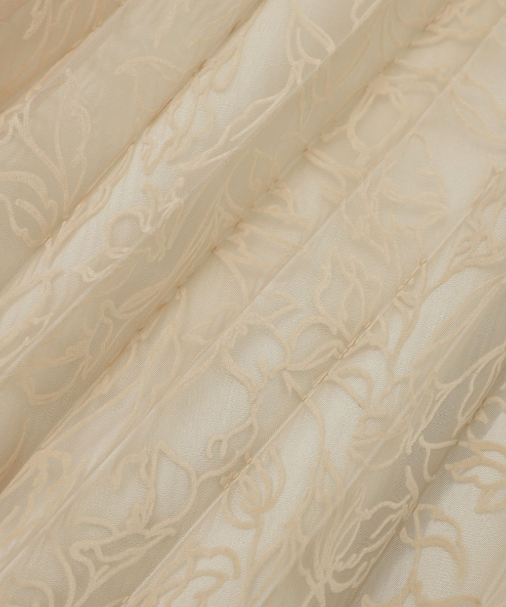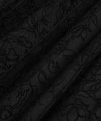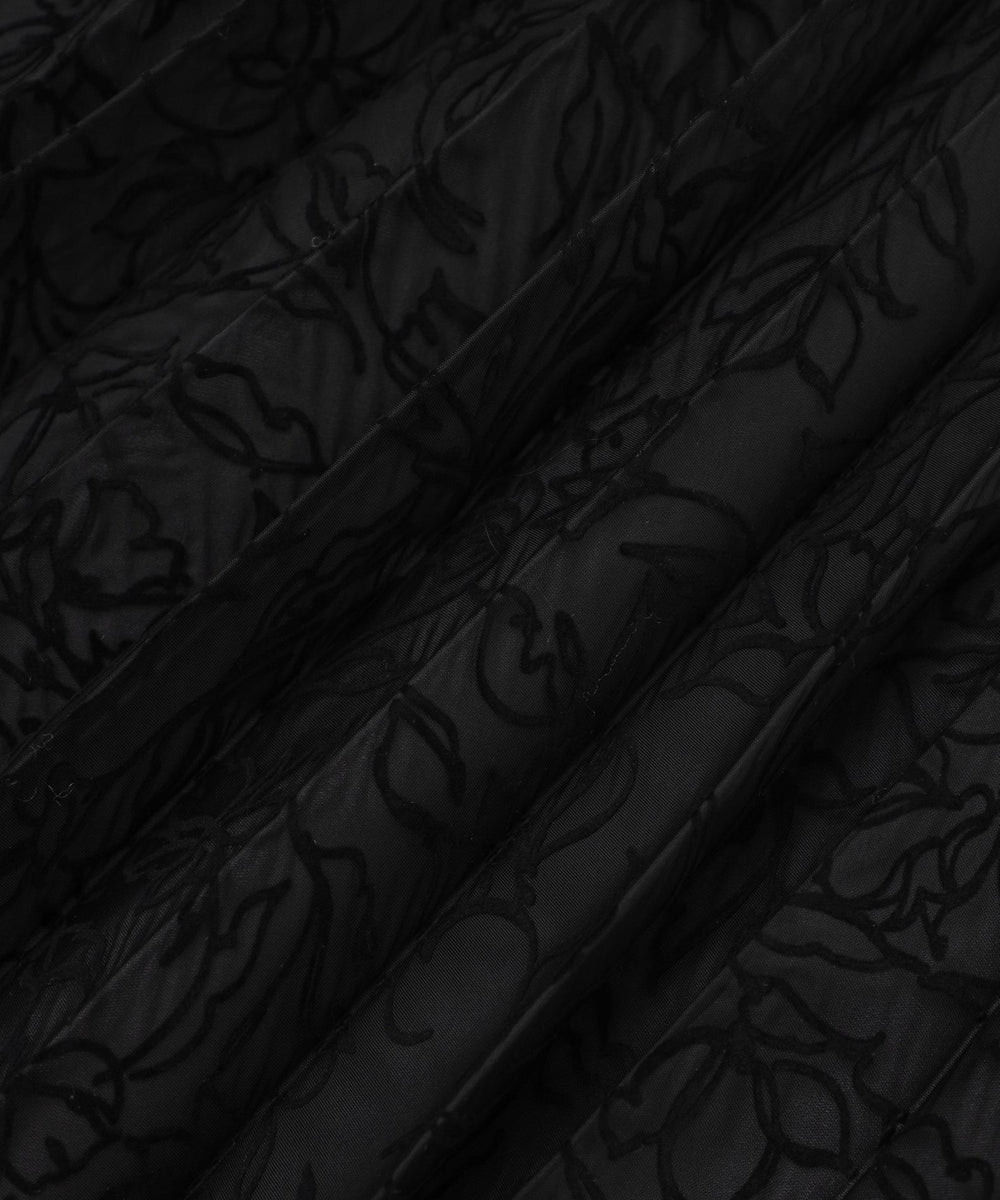 マットな質感が特徴の柔らかく、しなやかなオーガンジー素材に花柄のフロッキープリントを施した表情感のある素材を使用しています。