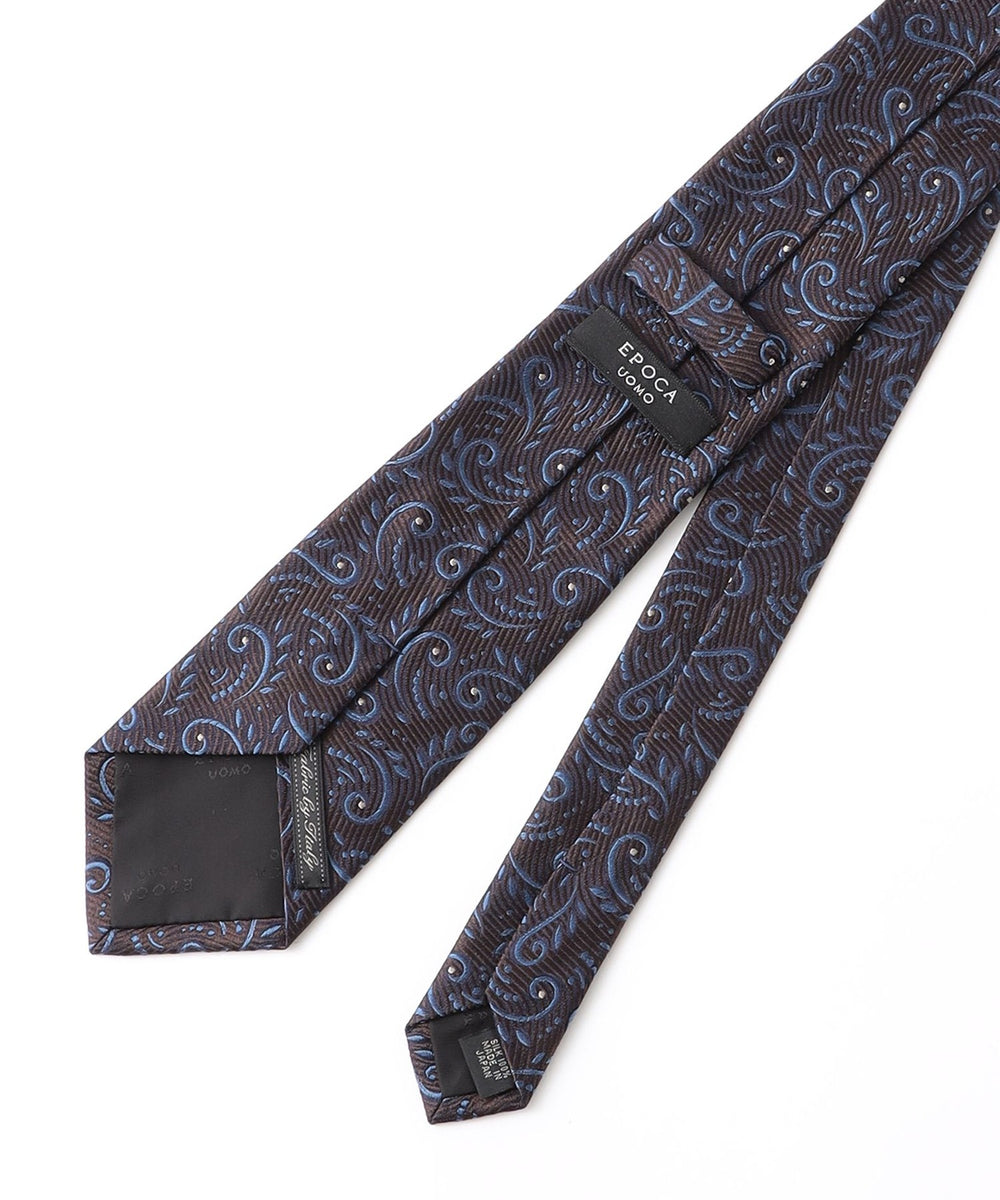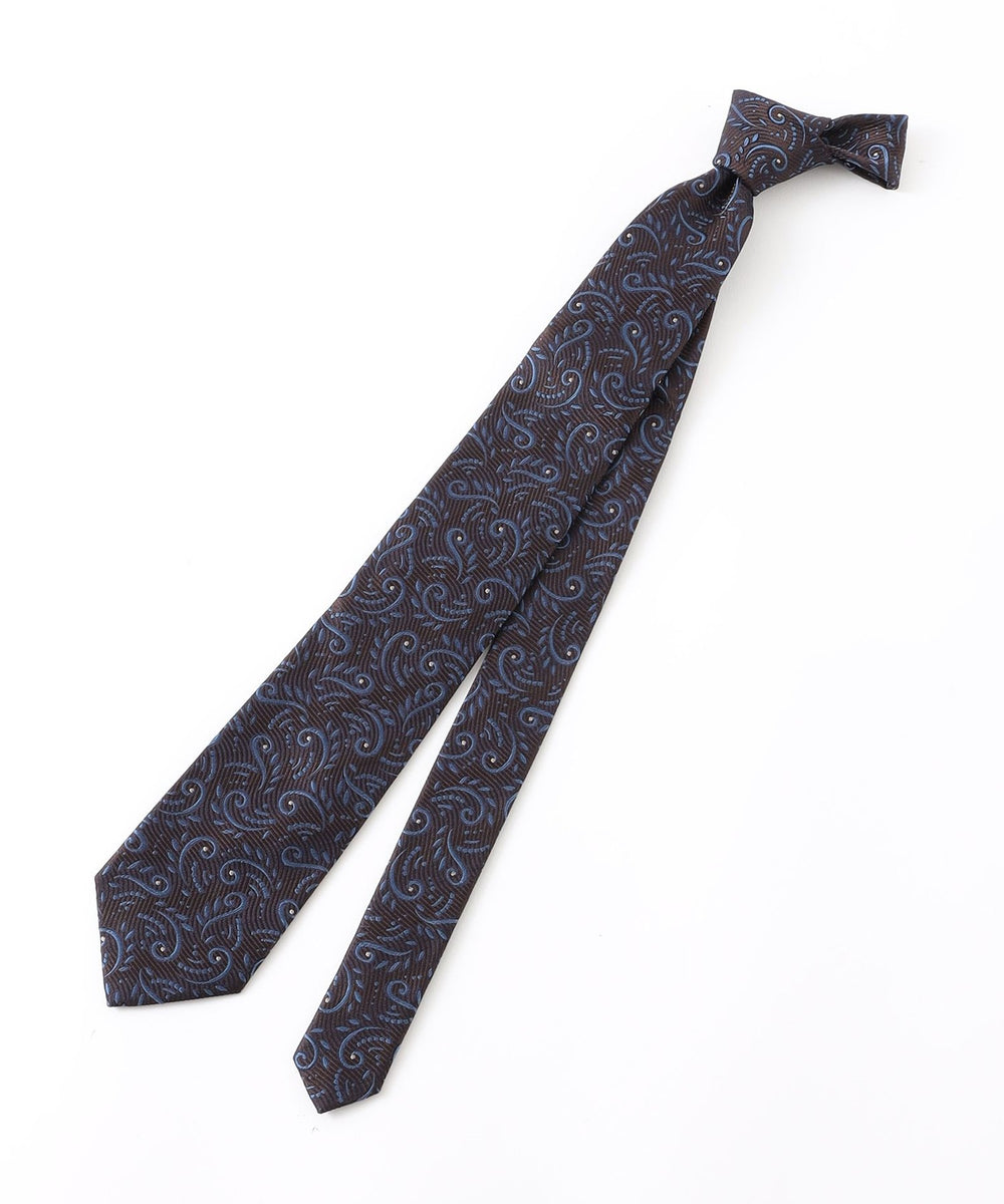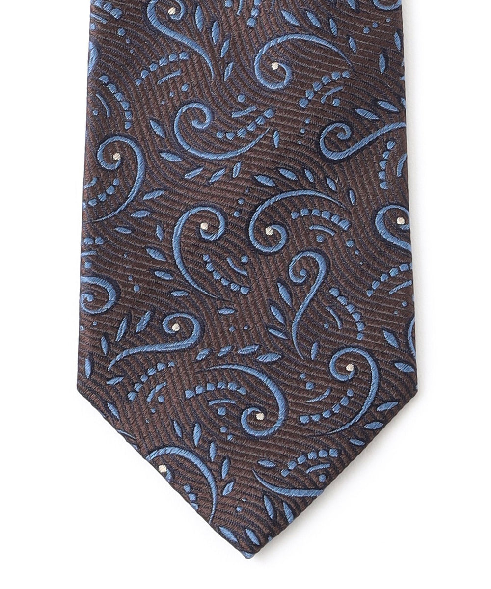 ジャカード織りで表現した繊細なペイズリーパターンが目を引くシルクタイ。ブラウンベースに相性の良いブルーのペイズリーがなんとも洒脱。絹の光沢感と洗練されたペイズリー柄が高級感を漂わせる一本。