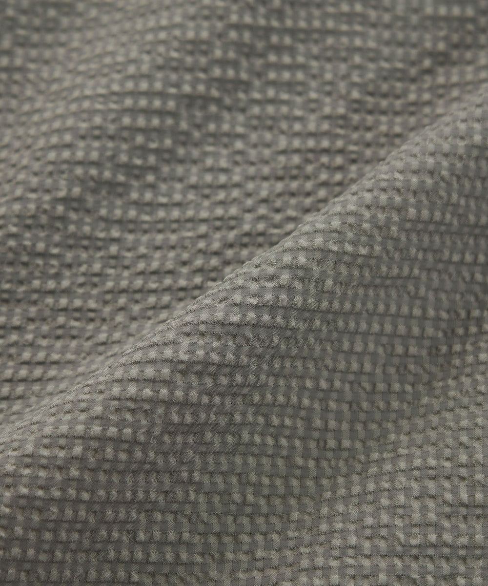 二重織り機を使用し、タテ糸ヨコ糸共に交互にテンションを変えて織り上げることで、凹凸に仕上げたシアサッカー素材。さらに種類の違う糸を使用し、色の濃淡を表現。