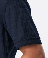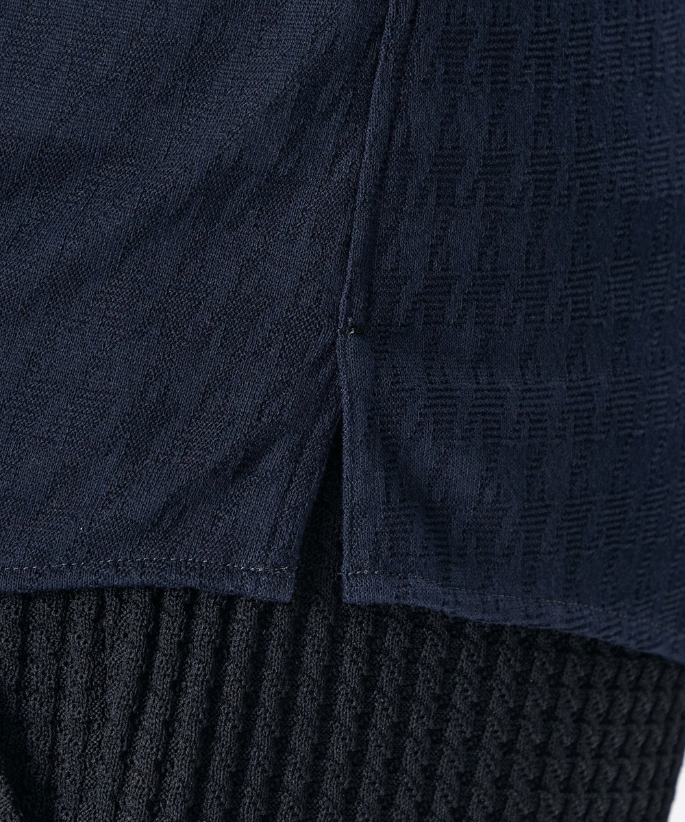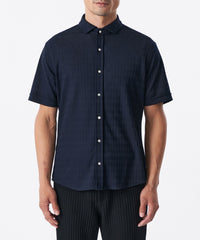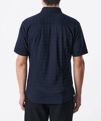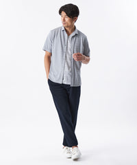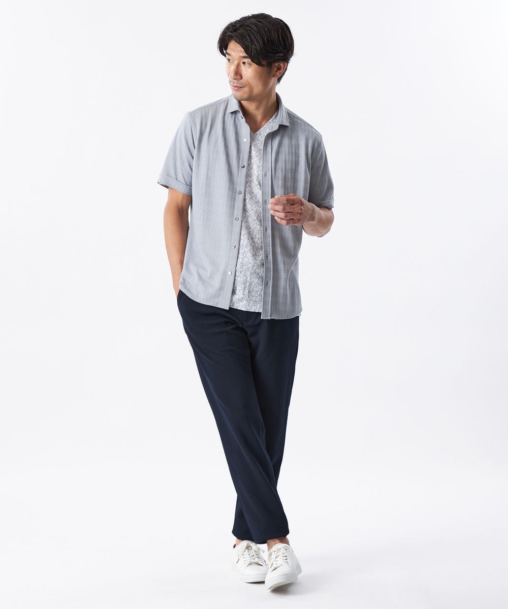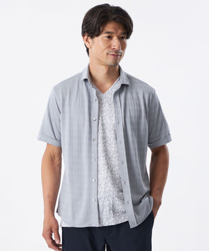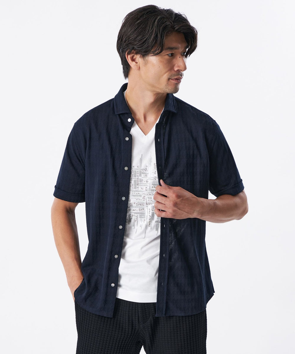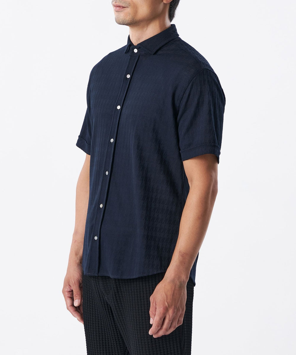 糸を強撚することで、夏場でもサラッとした肌ざわりが特徴のシャドー千鳥柄の半袖カジュアルシャツ。