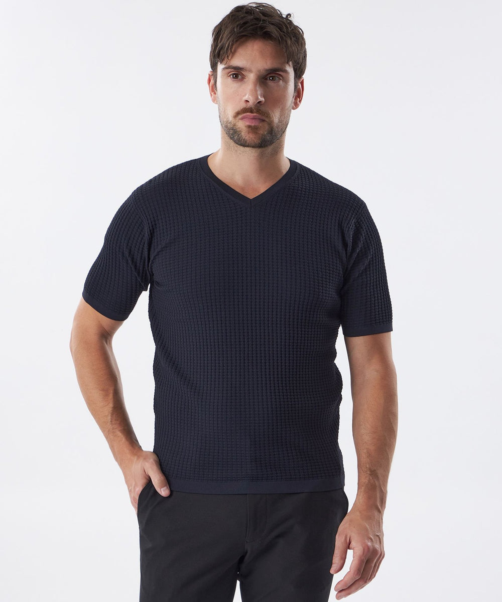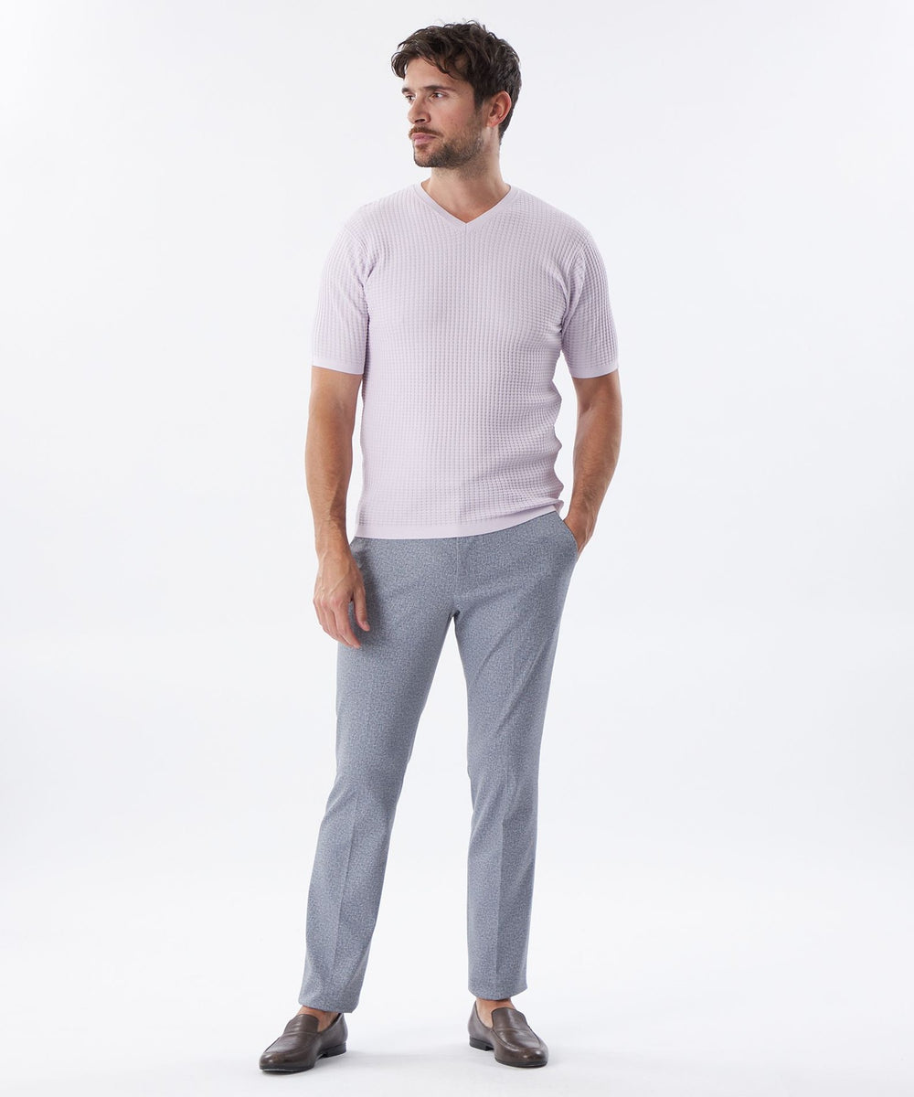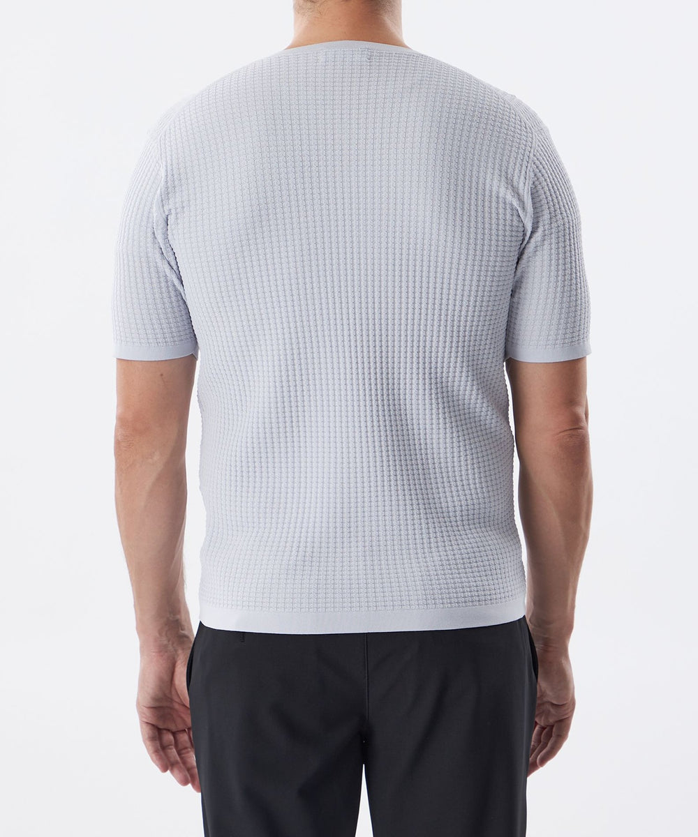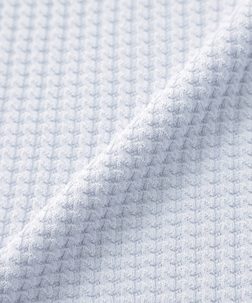 インターレース加工のエアー混繊糸(糸の進行方向に対して垂直にエアー圧をかける事で素材同士を混繊させ糸を作り出す手法)を採用。この糸はキックバック性に優れ、軽量で膨らみが有ります。ストレッチ性が有るので編み目が引き締まり、編地に上品な凹凸感が生まれます。アセテートはダルタイプ(光沢の無いマットな糸)を採用する事で透け感を軽減。また、アセテートの特性である しなやかで肌触りの良い風合いも併せ持っています。ご家庭で手洗いが可能です。