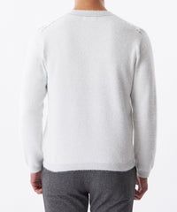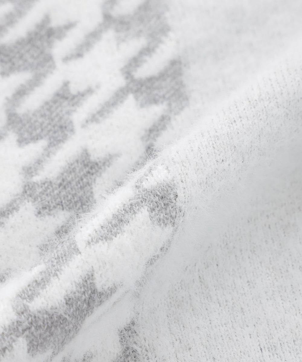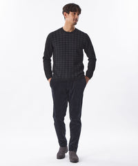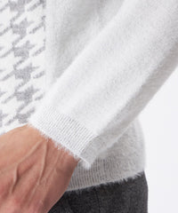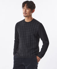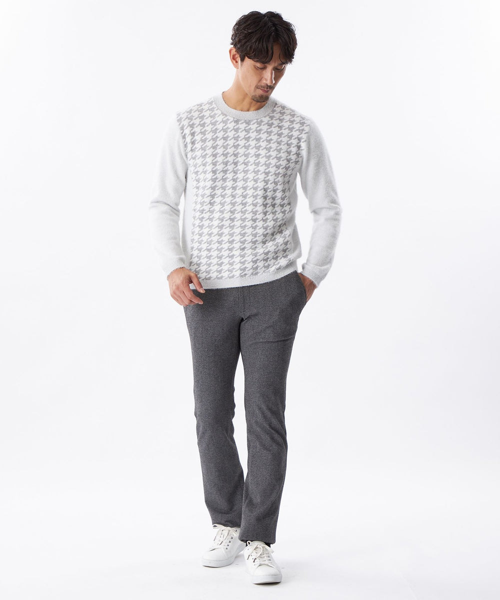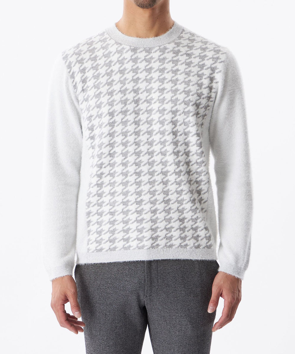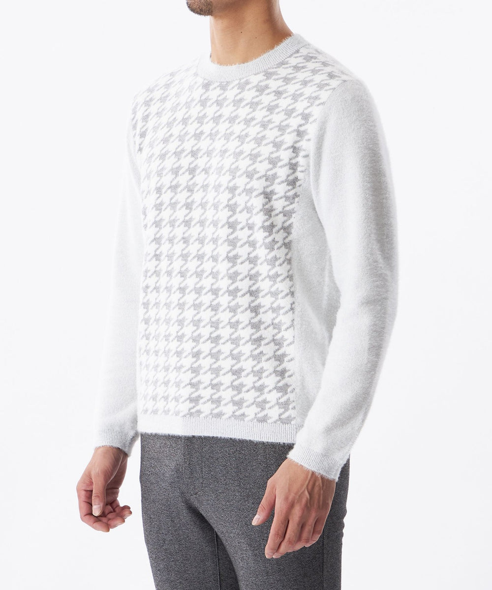紳士服のしっかりとした見た目を意識し仕上げたクルーネックニット。フロント全面を千鳥柄にせず、脇を無地にする事でスッキリと細身に見える視覚効果を狙った一着。