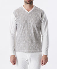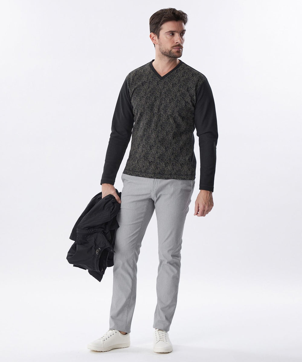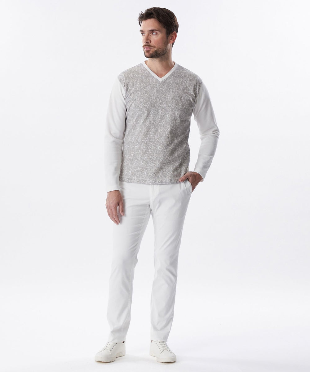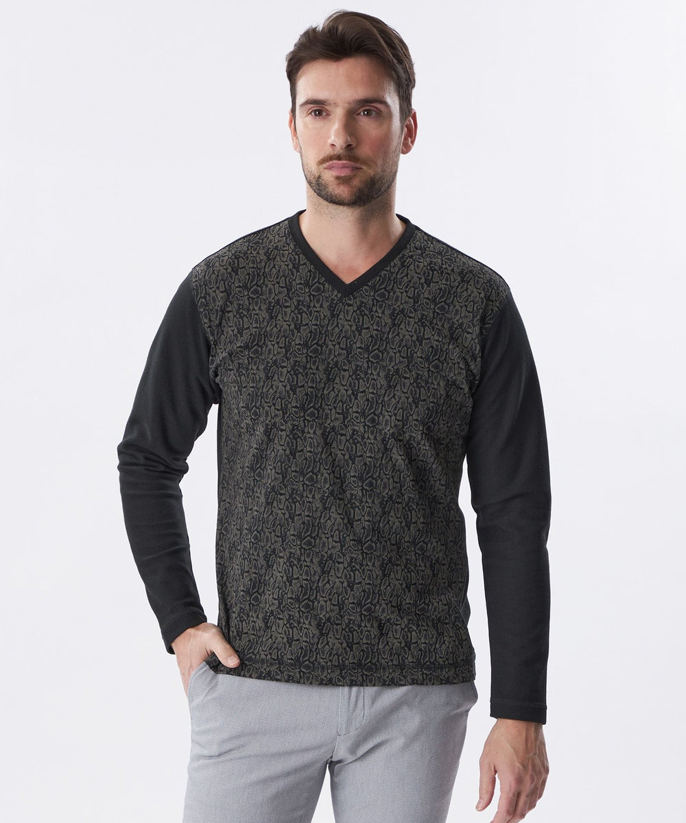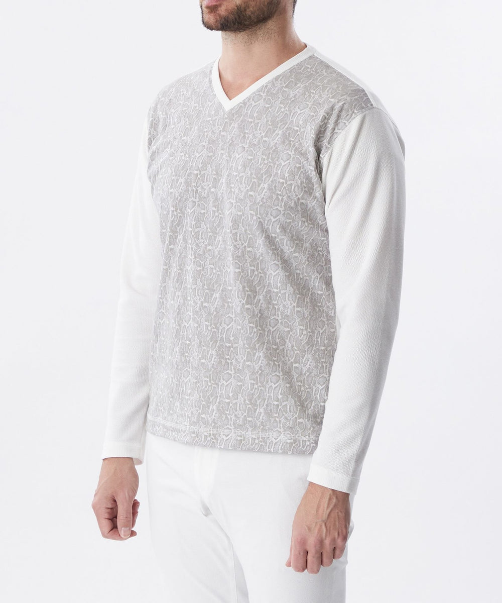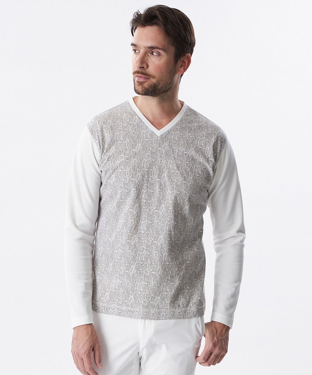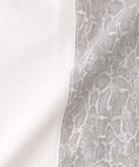 袖、後身を凹凸ジャカードのジャージ生地を使用し、前身に顔料プリントと発泡プリント(特殊な手法で立体感のあるプリント)をし、上品な凹凸の表情をだしたヘビ柄プリント生地を使用しています。柄の表情と素材コンビがポイントです