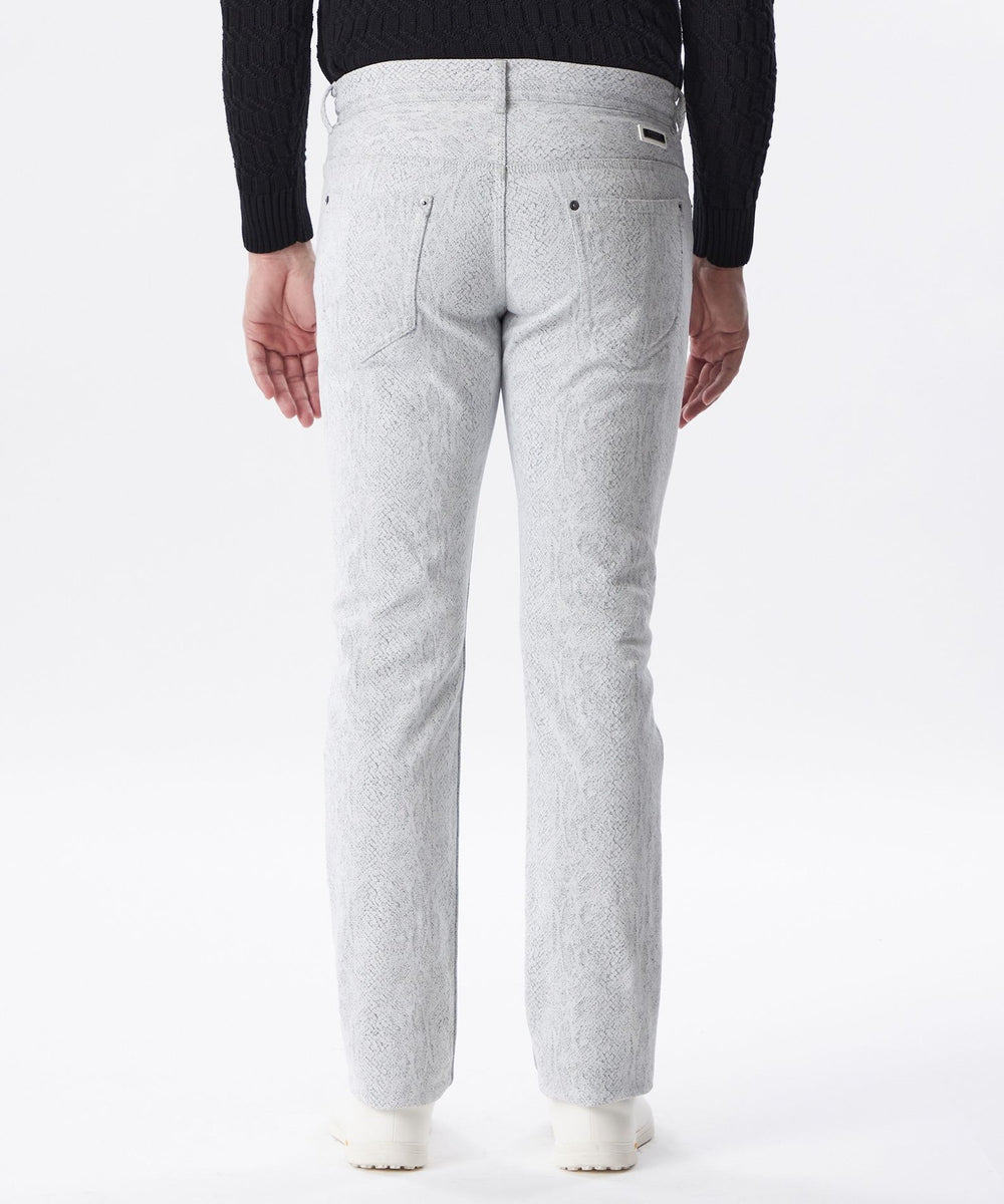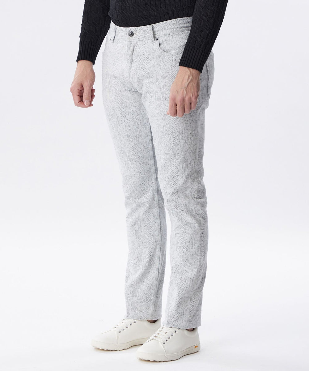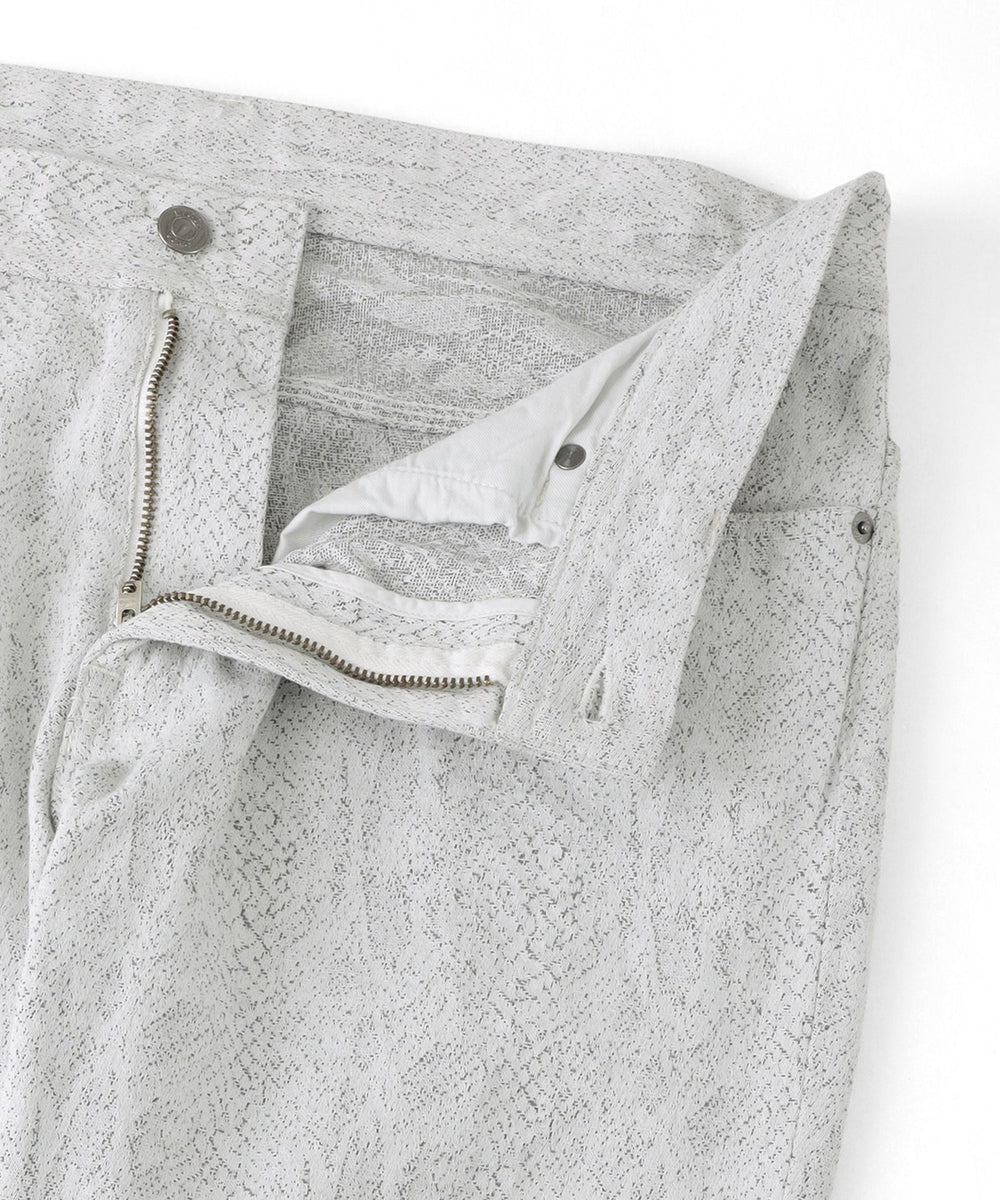 ジャカード織機で織りあげたパイソン柄のデニム素材です。緯糸は柄の間から見え隠れするように色糸と白糸を交互に配列し、パイソンの有機的な雰囲気を表現しました。