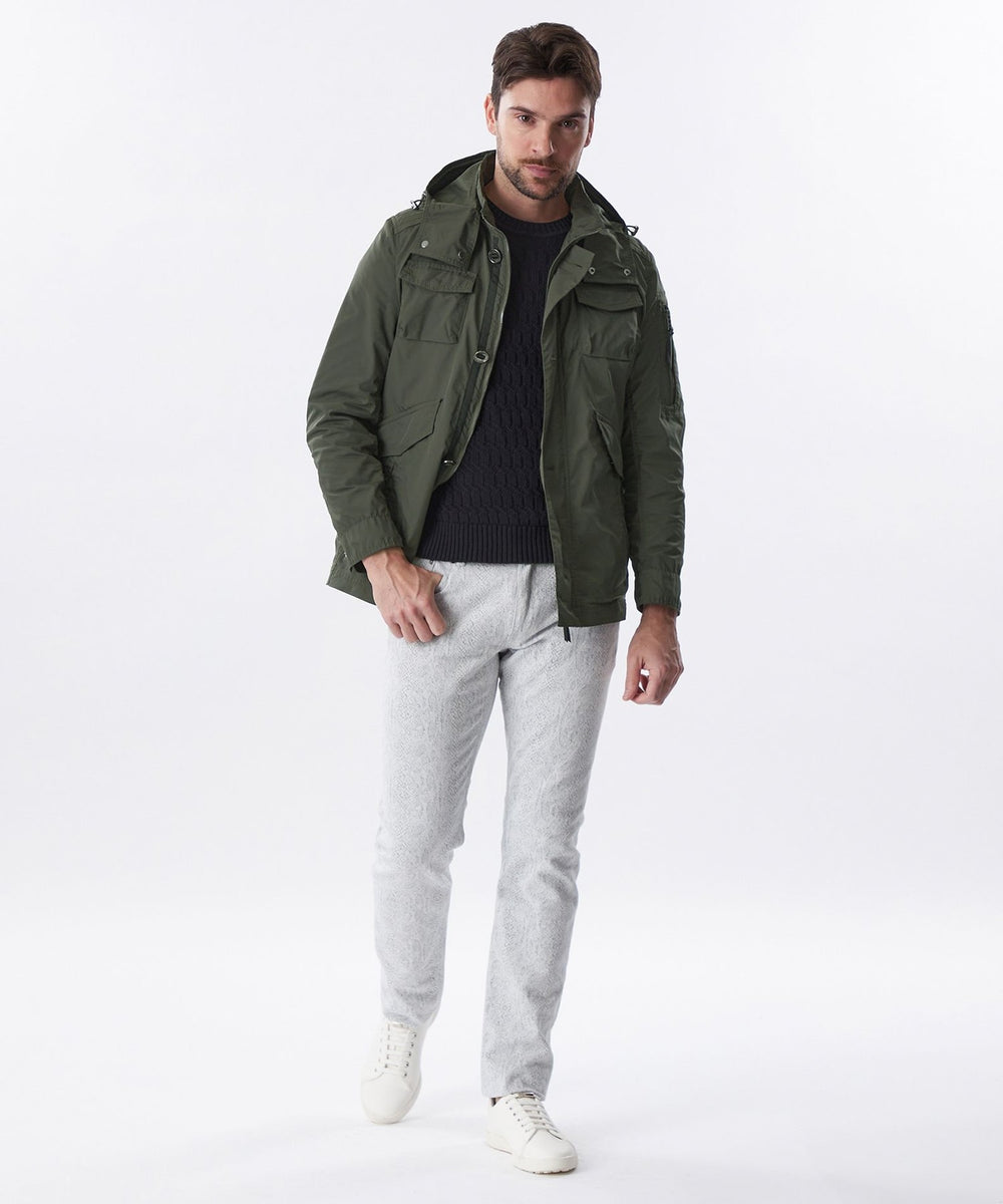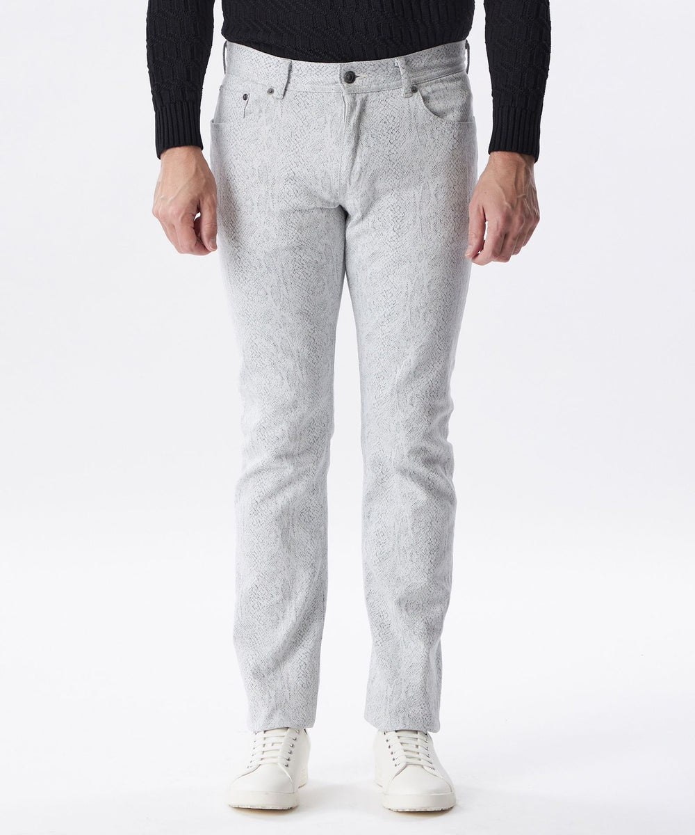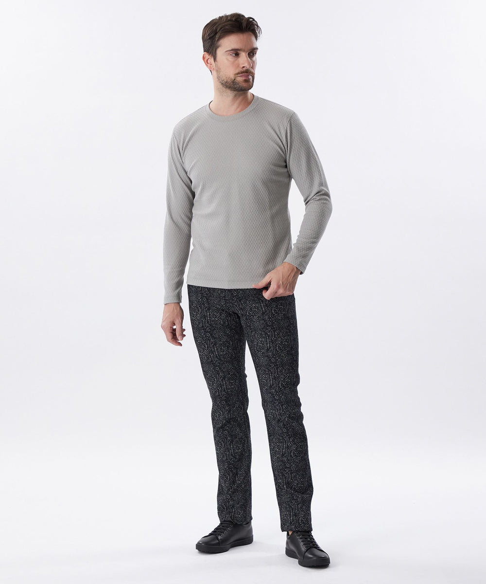 ジャカード織機で織りあげたパイソン柄のデニム素材です。緯糸は柄の間から見え隠れするように色糸と白糸を交互に配列し、パイソンの有機的な雰囲気を表現しました。
