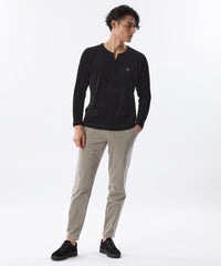 レーヨンを入れた4者混素材ならではのソフトな肌触りとストレッチ性、色の深みが特徴のコーデュロイパンツ。【コーディネート】