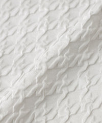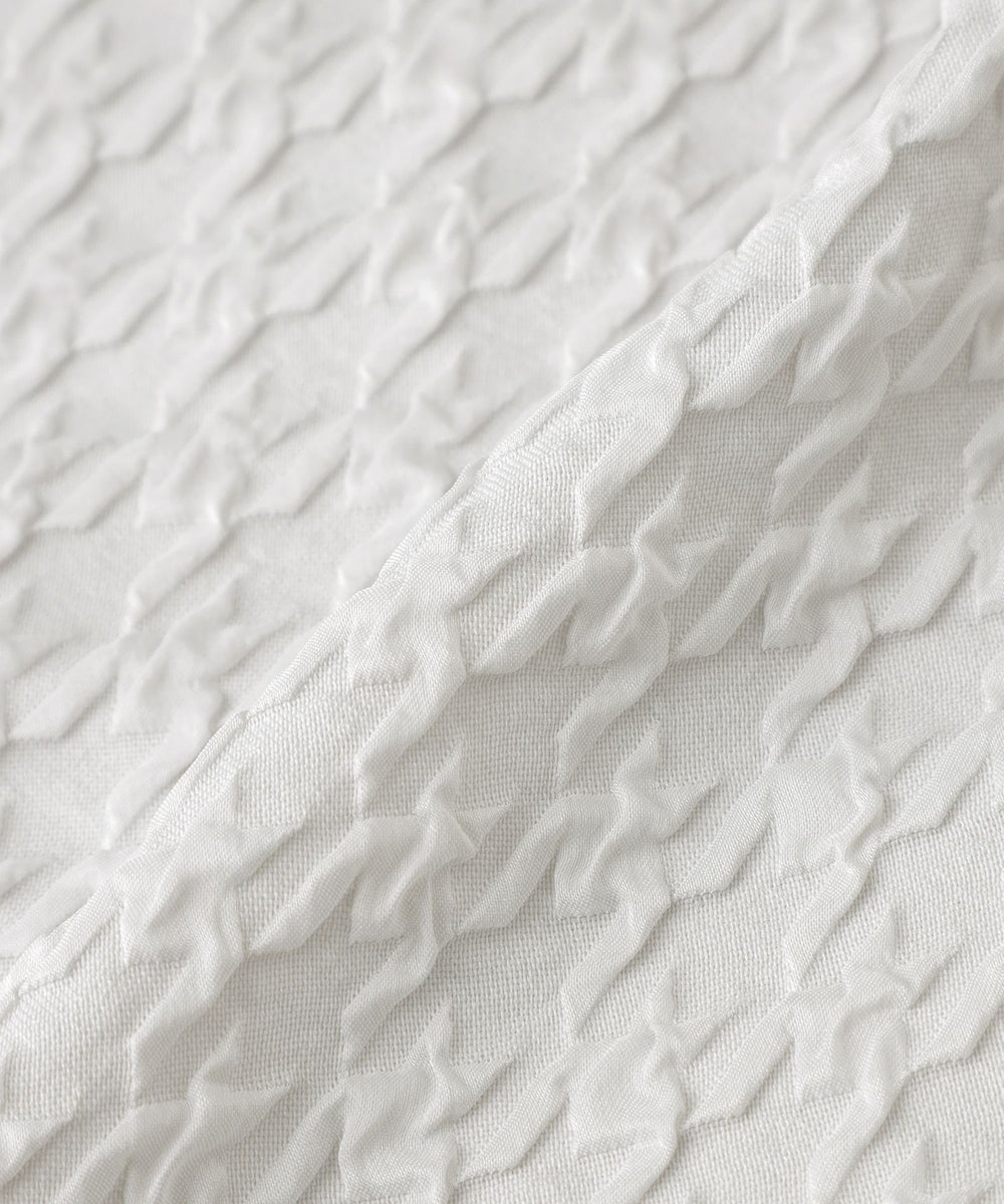 二重織りにて二層の生地を繋ぐ面と繋がない面を作り、立体的な柄が浮かび上がらせるという桐生産地の技術が詰まった生地を採用。