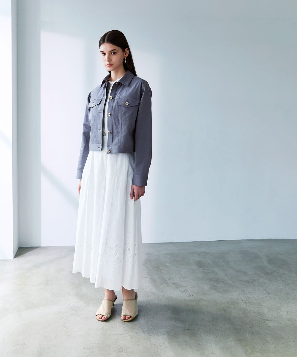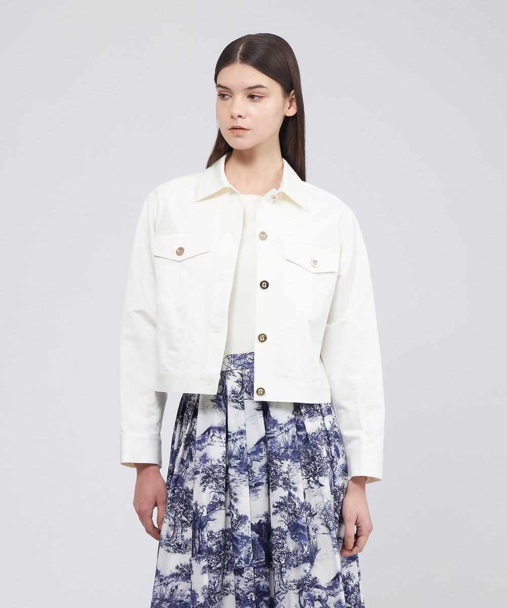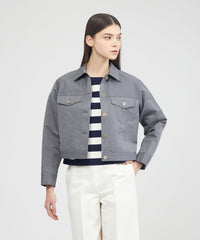 Gジャンディテールのコンパクトライトジャケットです。素材の軽量さに加え、ショート丈で見た目も非常に軽やかな印象です。Gジャンの仕様はそのままに、メタルボタンで上品さもプラスしたアイテムです。同素材のパンツ(品番:M5R18541)とセットアップでも着用いただけます。