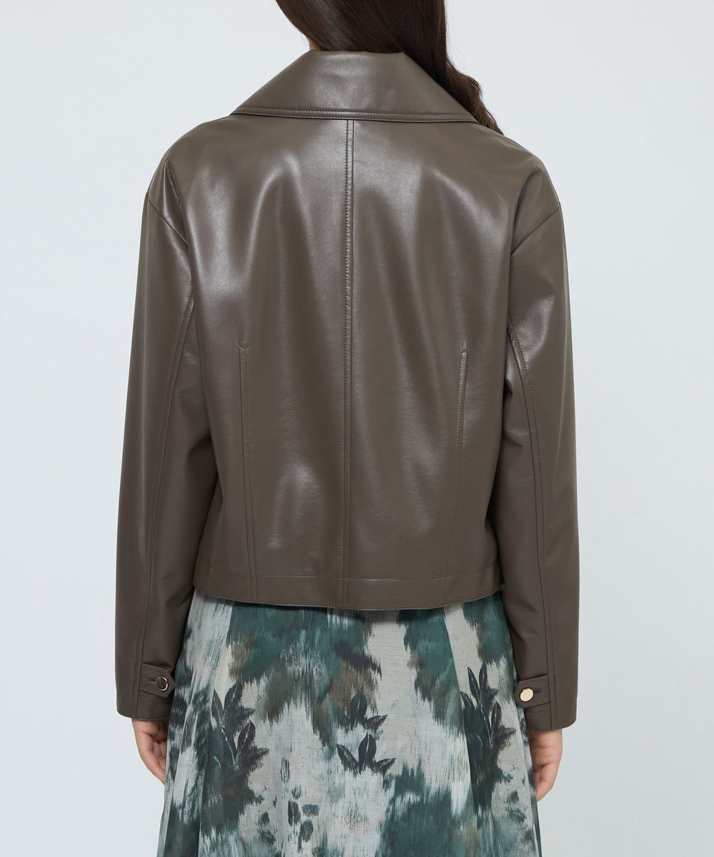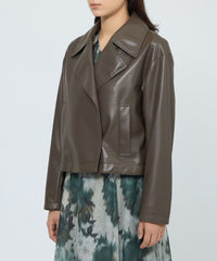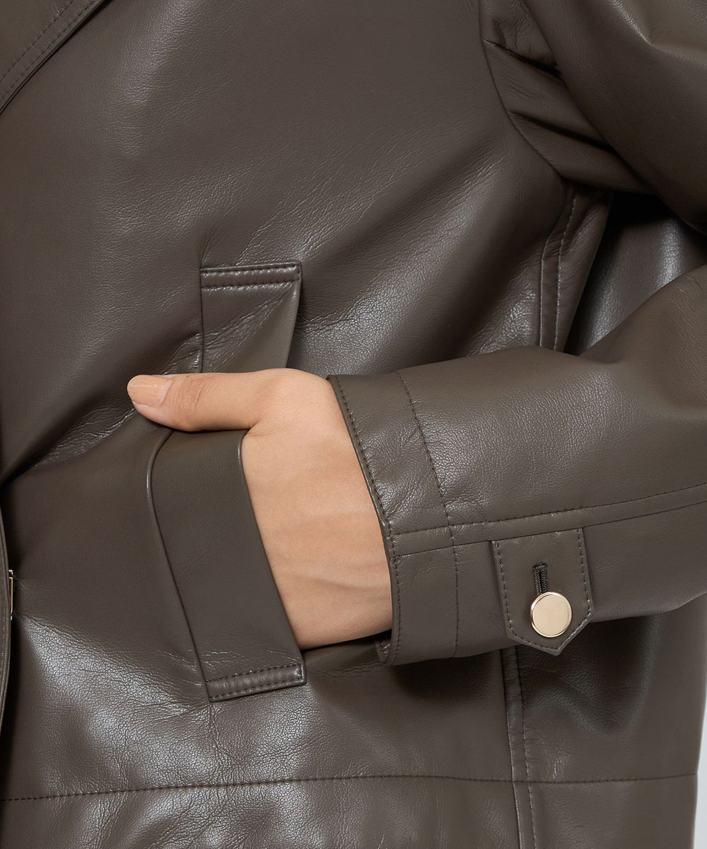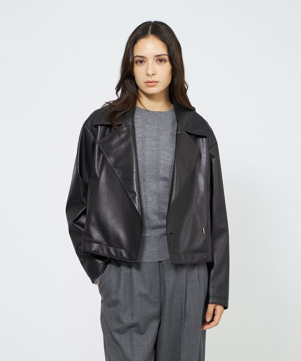 大きめの襟が印象的な、シンセティックレザー素材のジャケットです。ややゆとりのあるシルエットが雰囲気のある着こなしへと昇華させてくれます。カーディガン感覚で使える軽やかな着用感、厚手のインナーの上からも羽織やすく、気温に合わせた着回しにぴったりの一着ライトアウターです。
