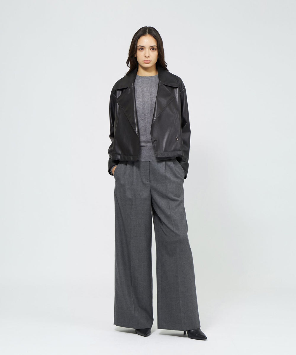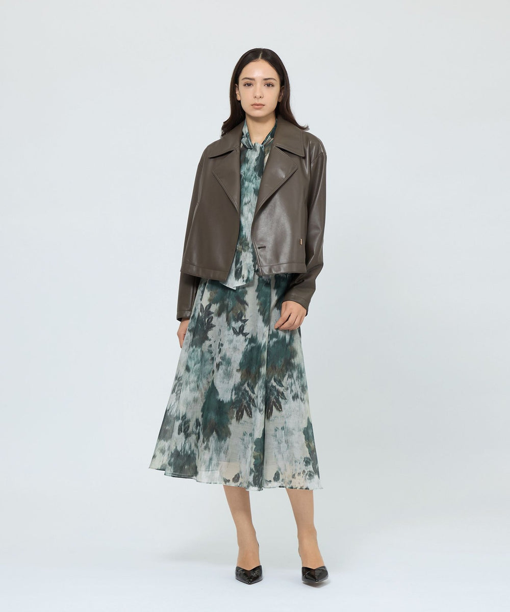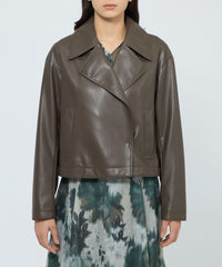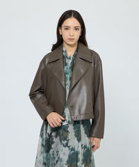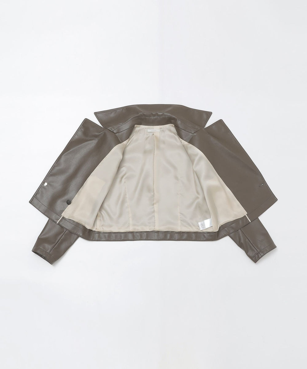 大きめの襟が印象的な、シンセティックレザー素材のジャケットです。ややゆとりのあるシルエットが雰囲気のある着こなしへと昇華させてくれます。カーディガン感覚で使える軽やかな着用感、厚手のインナーの上からも羽織やすく、気温に合わせた着回しにぴったりの一着ライトアウターです。