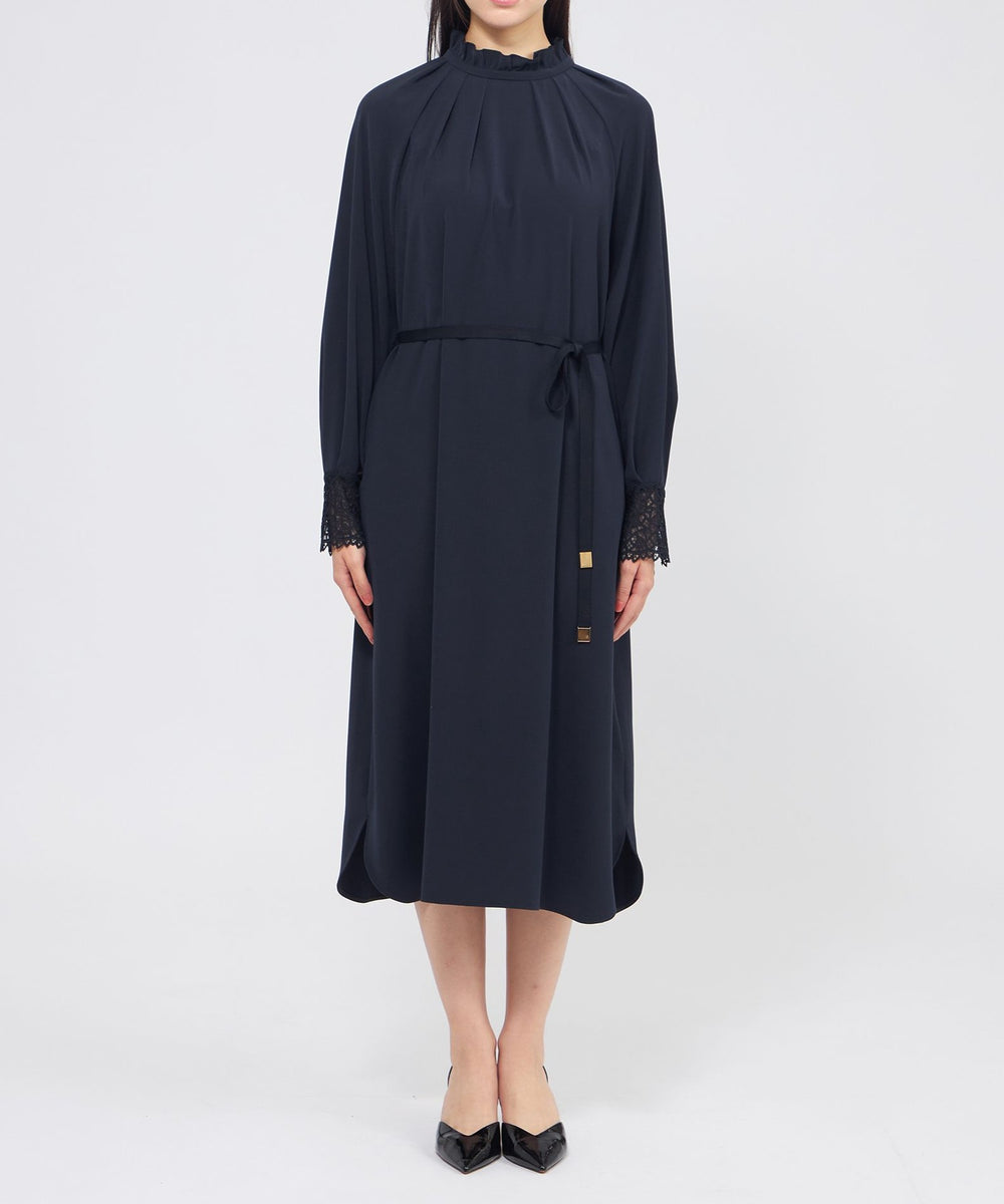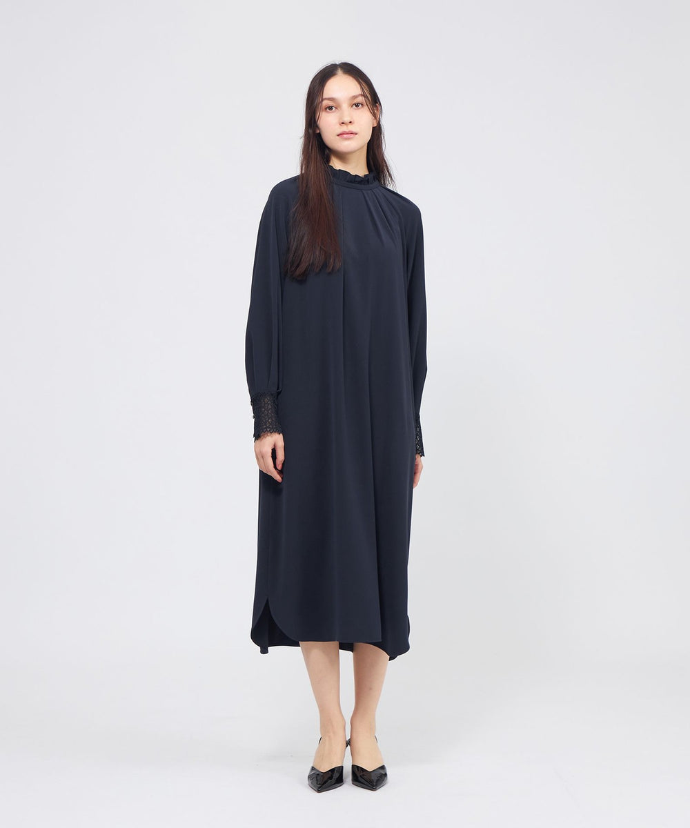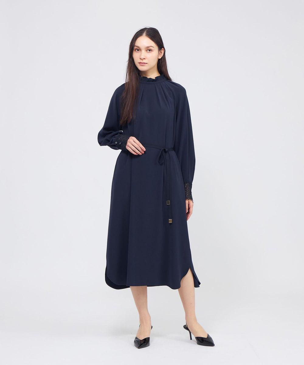裾に向かって広がるAラインシルエットのサックワンピースです。たっぷりとした分量感でリラックスした雰囲気もありながら、襟元のフリルやレースのカフスが上品さを添えます。付属の細幅ベルトでウエストマークしたメリハリのあるスタイリングも楽しんでいただけます。