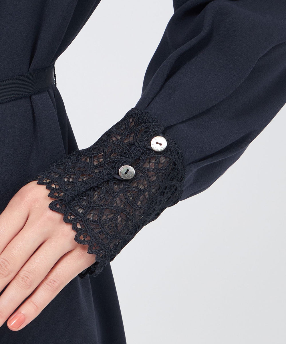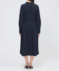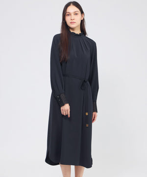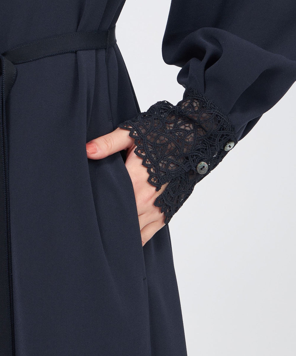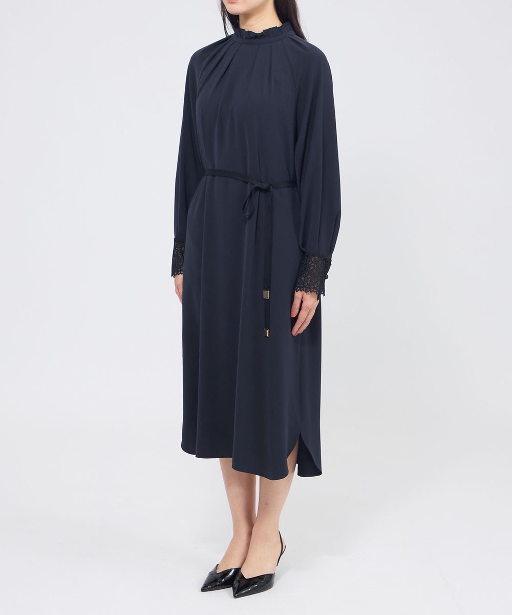 裾に向かって広がるAラインシルエットのサックワンピースです。たっぷりとした分量感でリラックスした雰囲気もありながら、襟元のフリルやレースのカフスが上品さを添えます。付属の細幅ベルトでウエストマークしたメリハリのあるスタイリングも楽しんでいただけます。