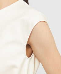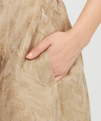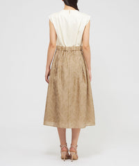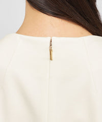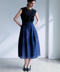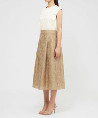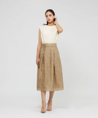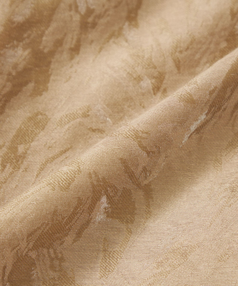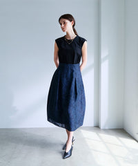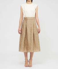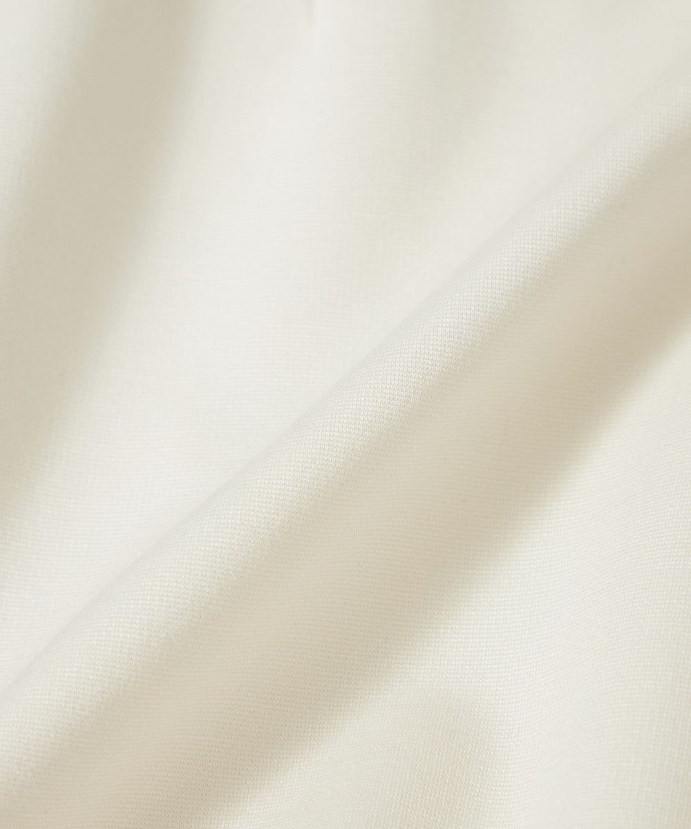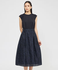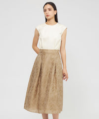 上身頃は、しっかりとした肉感とキックバックの良さが着心地のよいストレッチポンチです。スカート部分には、さりげない光沢感のナイロン分繊ブライト糸にコットンでナチュラル感を加えた、程よく綺麗なシアージャカード素材を使用しました。無地感覚で使える主張しすぎないエポカオリジナルの抽象柄で、