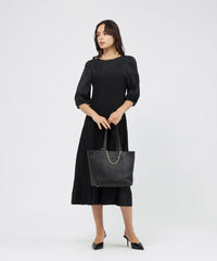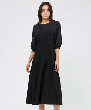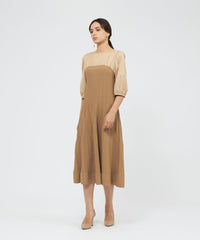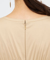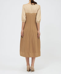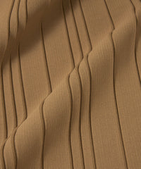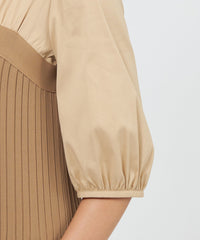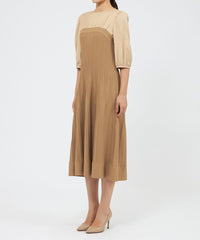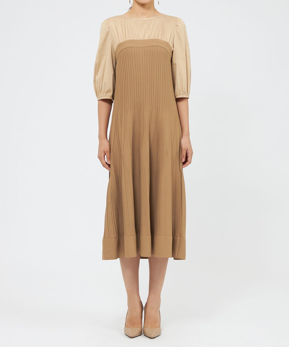コットンストレッチブロードを上身頃と袖に使用したニットコンビドレスです。引き返し編みを駆使したフィット&フレアの美しいシルエットが魅力です。ニット部分はミラノリブをベースに、表目と裏目を利用し凹凸のあるライン柄にしています。ブロード部分にはギャザーを効果的に施し、ブラウスのような軽やかな仕上がりに。同素材のカーディガン(品番:M5N28621)との合わせもおすすめです。