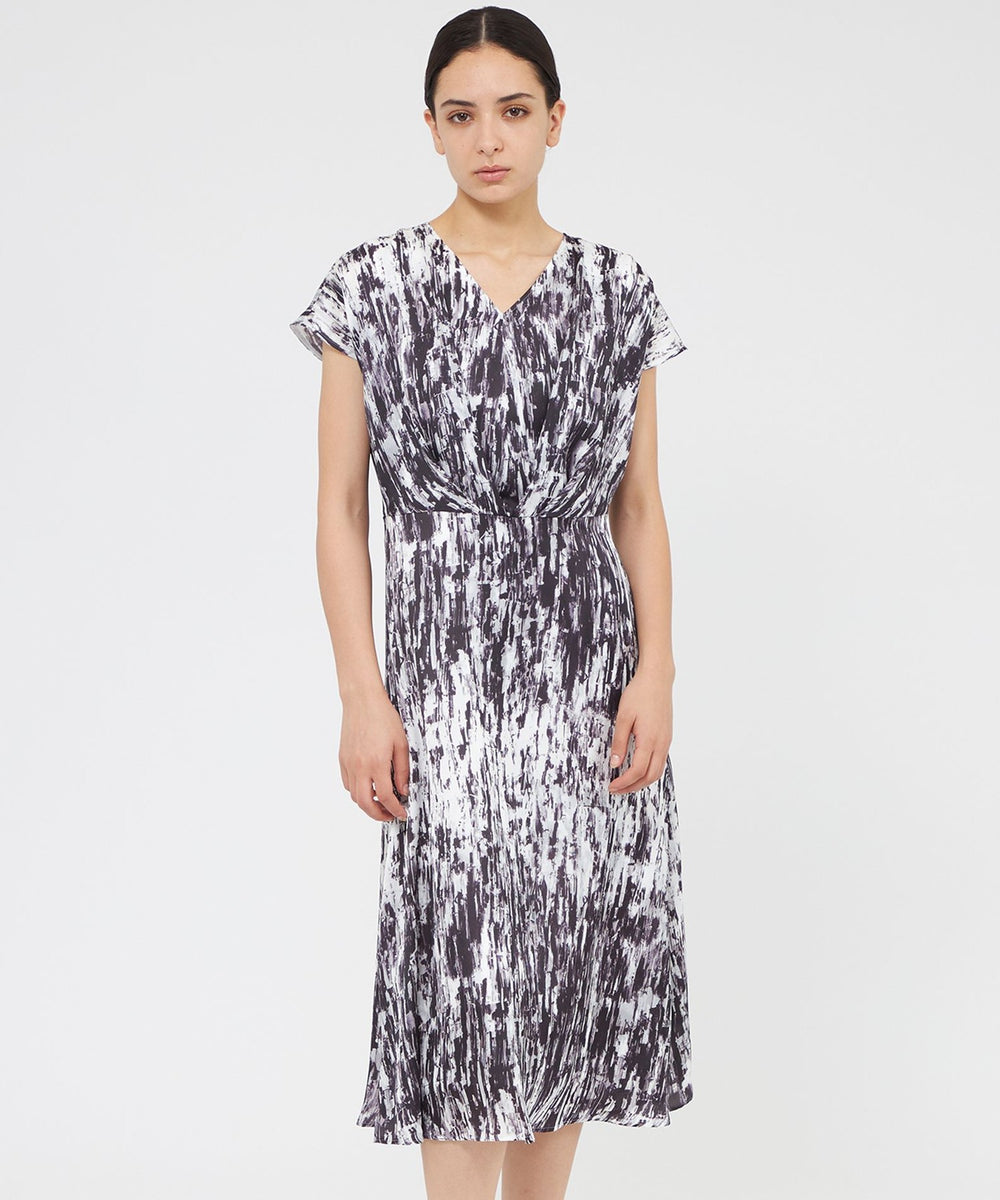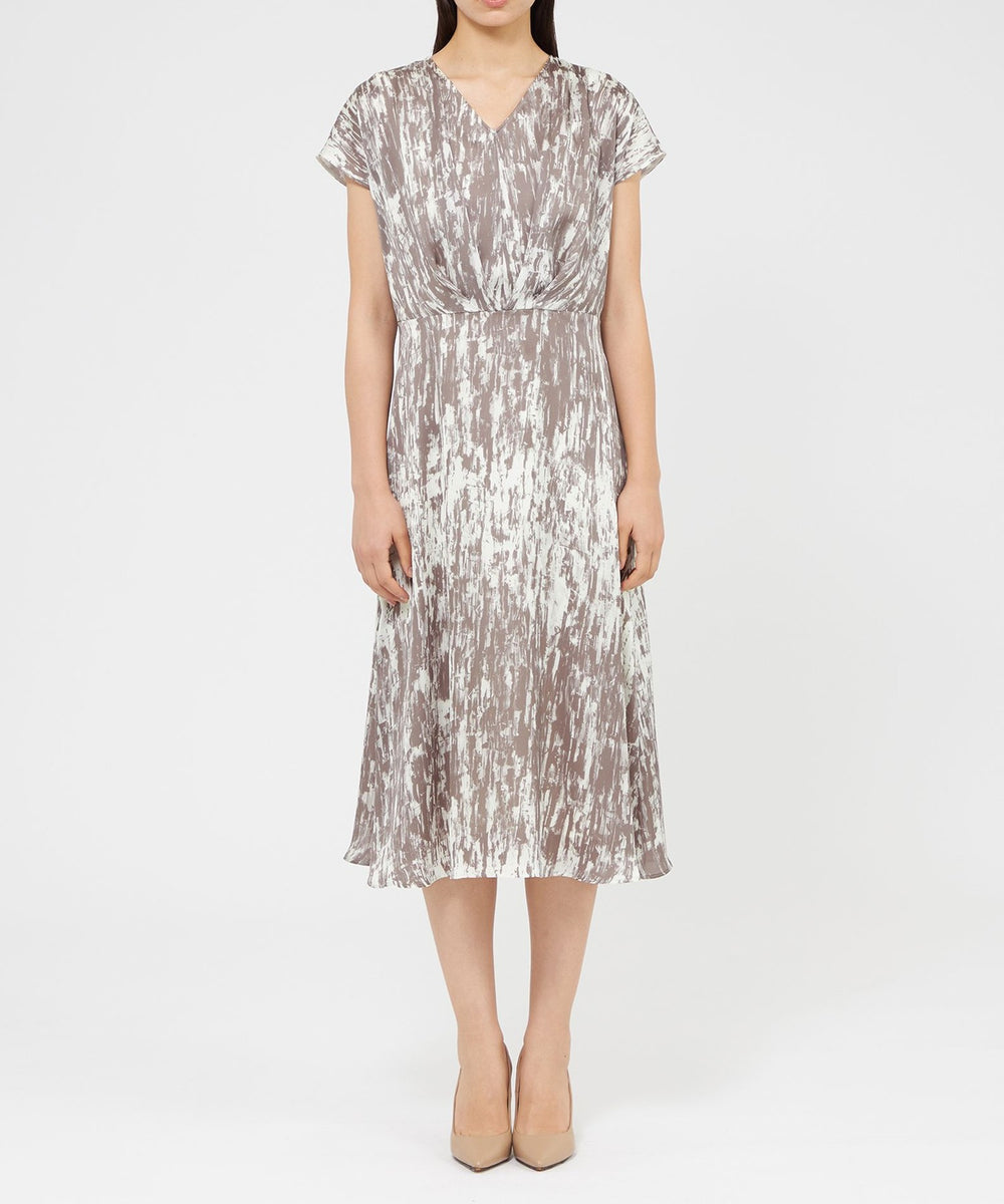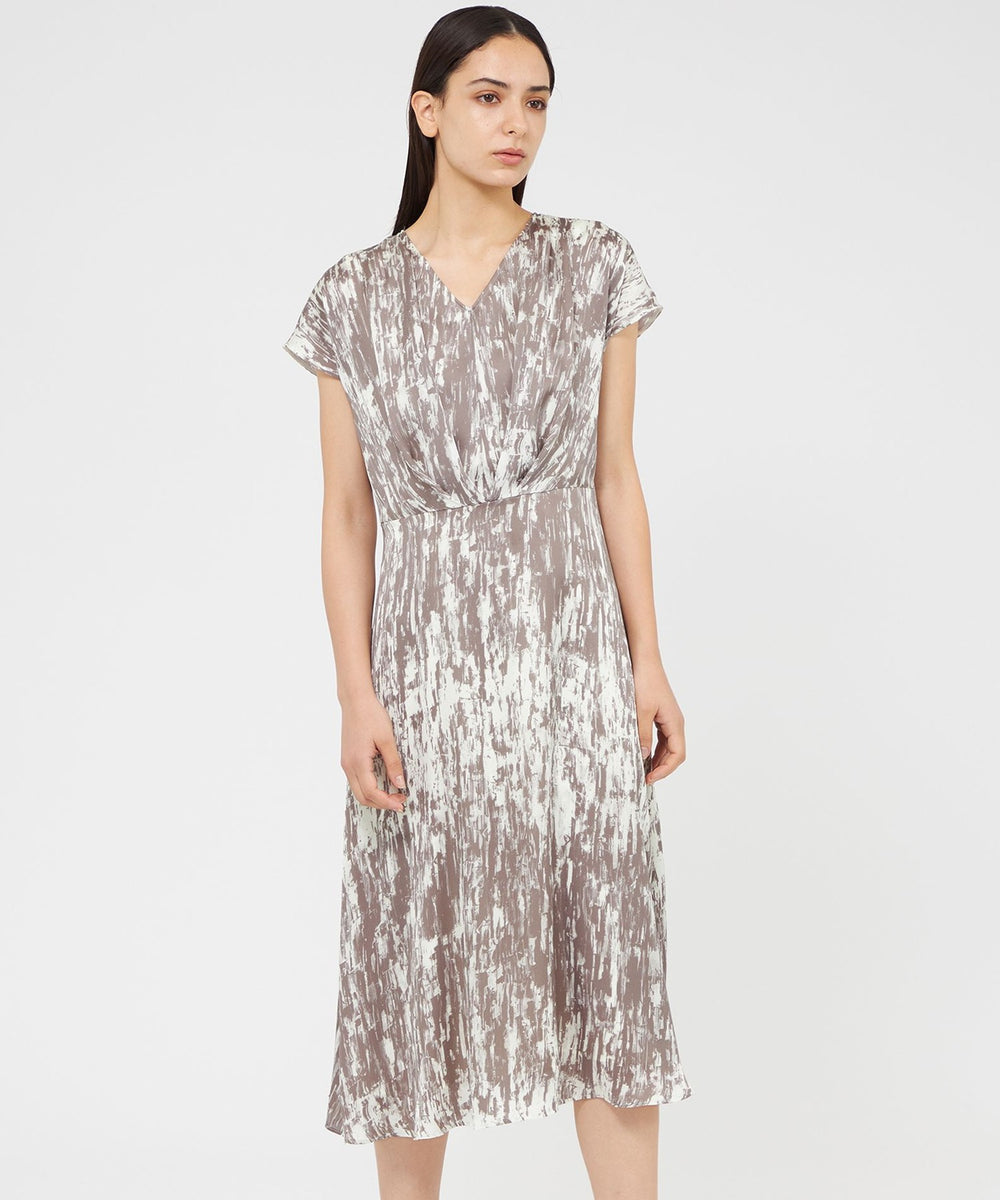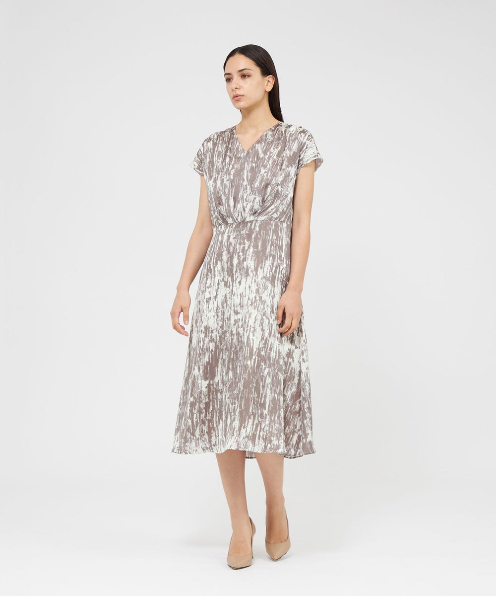 マットな光沢感のある表情が美しいプリントドレスです。品のよい開きのVネック、上半身はドレープを纏ったようなデザイン、流れるようなAラインのスカートがエレガントな印象に仕上がっています。ジャケット合わせはもちろん、単品でも様になるアイテムです。