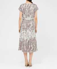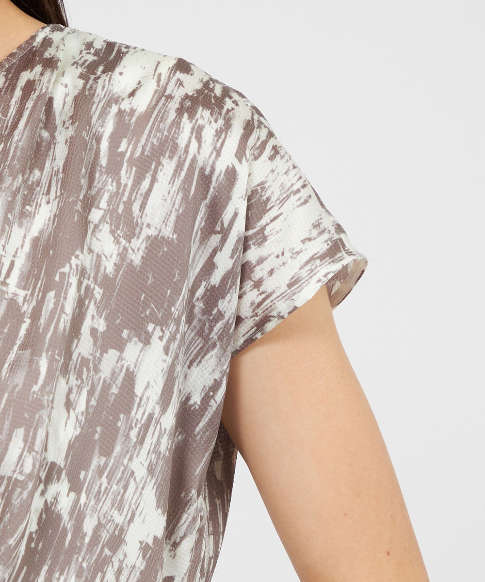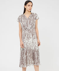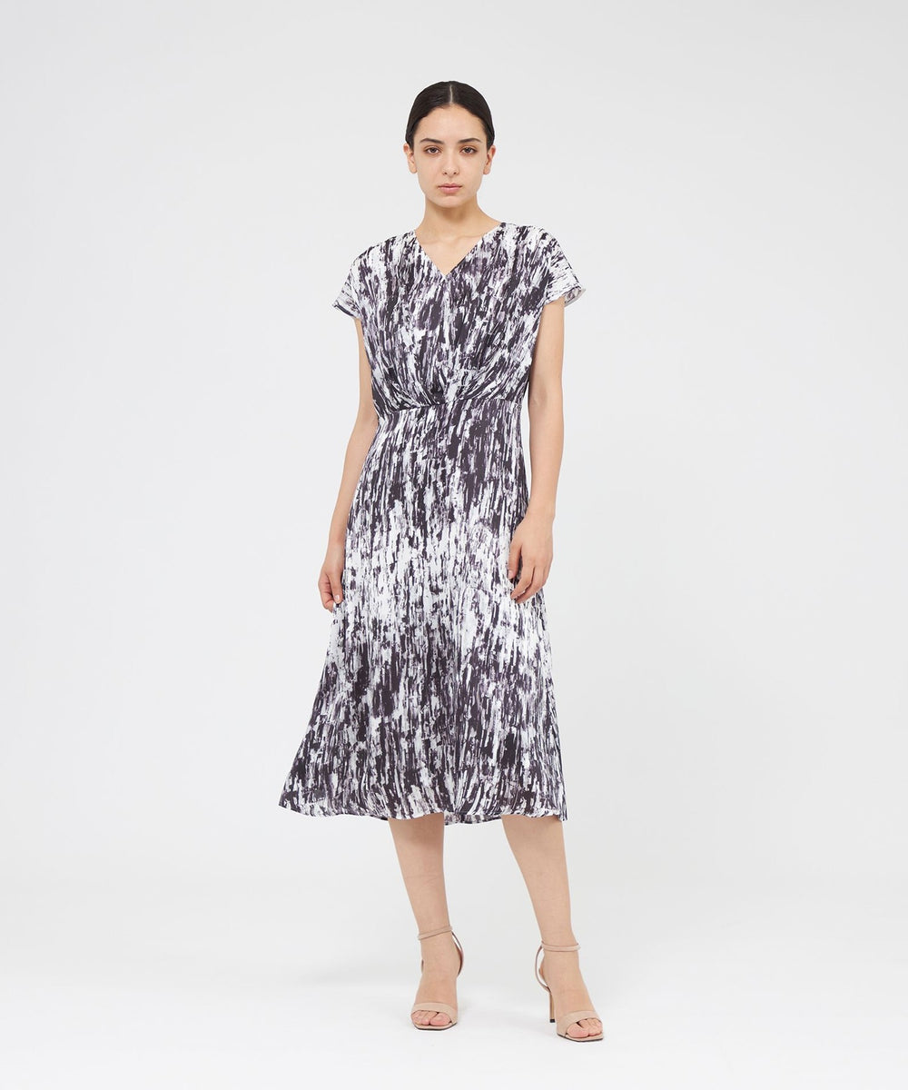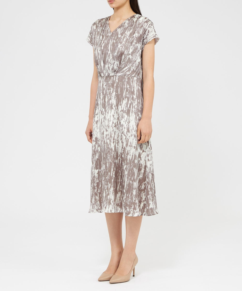 マットな光沢感のある表情が美しいプリントドレスです。品のよい開きのVネック、上半身はドレープを纏ったようなデザイン、流れるようなAラインのスカートがエレガントな印象に仕上がっています。ジャケット合わせはもちろん、単品でも様になるアイテムです。