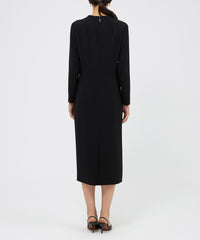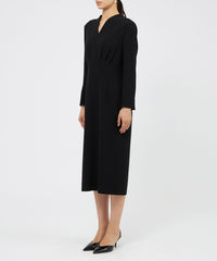 緩やかな衿元のV開きがエレガントなワンピース。絞り過ぎないIライン風のシルエットが程よくフィットし、身体のラインをすっきりときれいに見せてくれます。オケージョンにも活躍するアイテムです。同素材のジャケット(品番:M5E24624)、ボレロ(品番:M5E25624)との合わせもおすすめです。