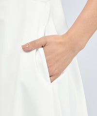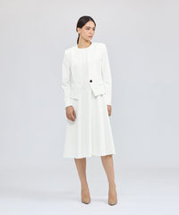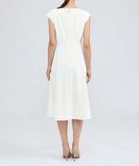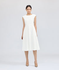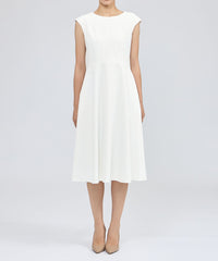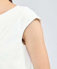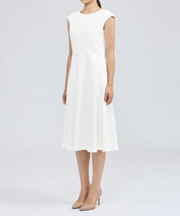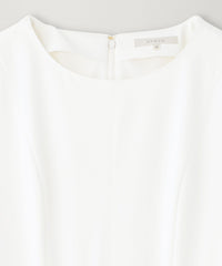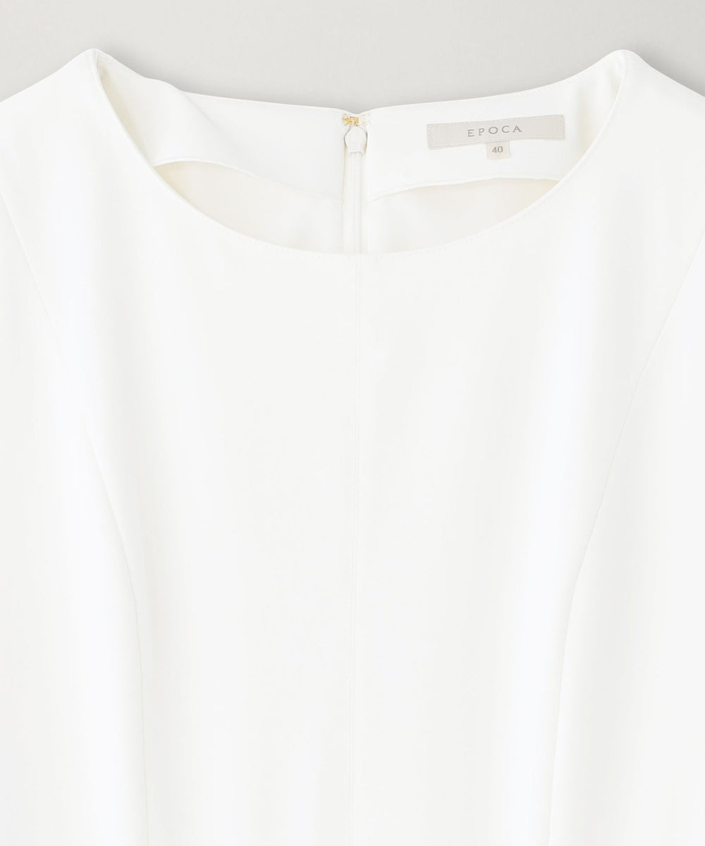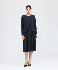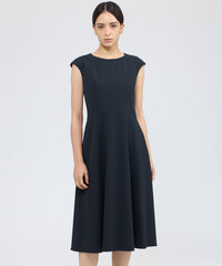 フレアシルエットが美しいエレガントドレスです。構築的なフォルムで、着用時のシルエットの美しさとストレッチの効いたコンフォータブルさが特徴です。同素材のジャケット(品番:M5E32589)と合わせて着用いただくのもおすすめです。