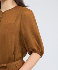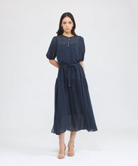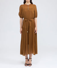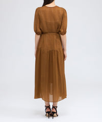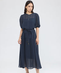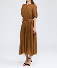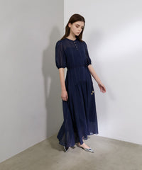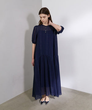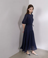 ティアードの切り替えがポイントのフレアマキシドレスです。繊細で軽やかな素材感とたっぷりとした分量感が雰囲気のある1着です。二の腕まで隠れる袖丈で、1枚で気軽に着用いただけます。グログランテープのベルトがアクセントになっており、ウエストをマークしてシルエットの変化も楽しめます。