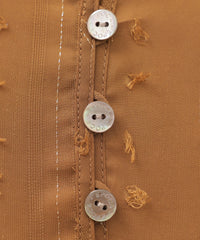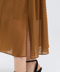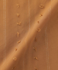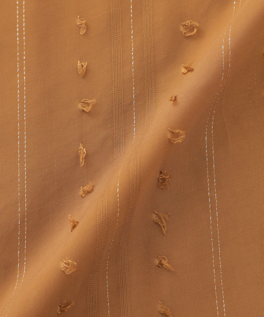 タテヨコ共にキュプラの強撚糸を使用したエポカオリジナルのシアージャカード素材です。強撚糸ならではのドレープ感とサラッとした風合い、キュプラ特有のハリや上品な光沢感が魅力です。生地は平織をベースに、紗織(しゃおり)というカラミ織の一種を取り入れシャドーストライプ柄を表現しています。トレンド感のあるラメとフリンジ感がデザインのポイントに。フリンジ部分は、平織部分に糸を重ね織りし、カットジャカードで仕上げた手の込んだ素材です。