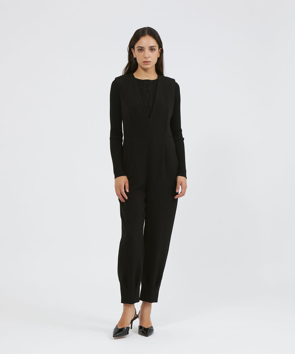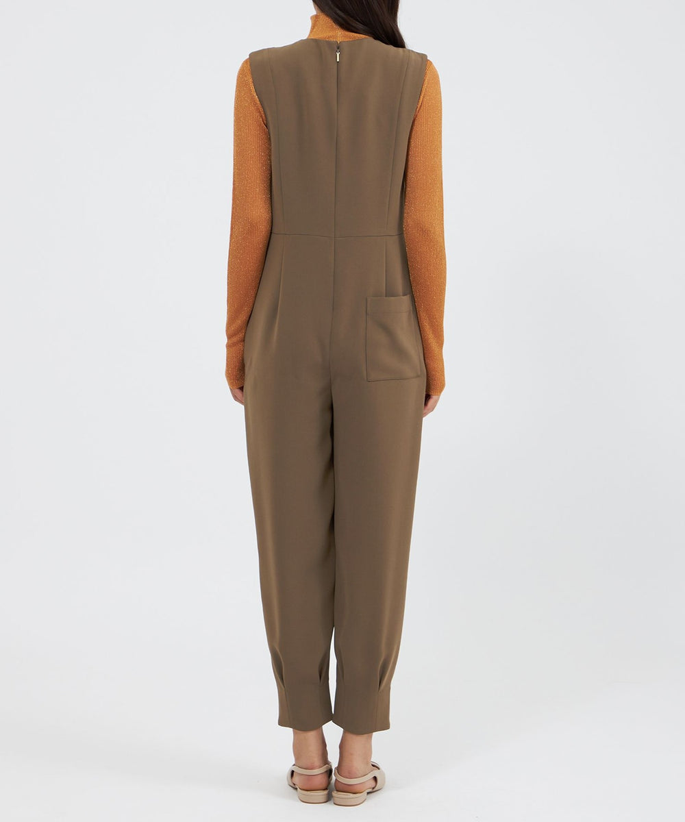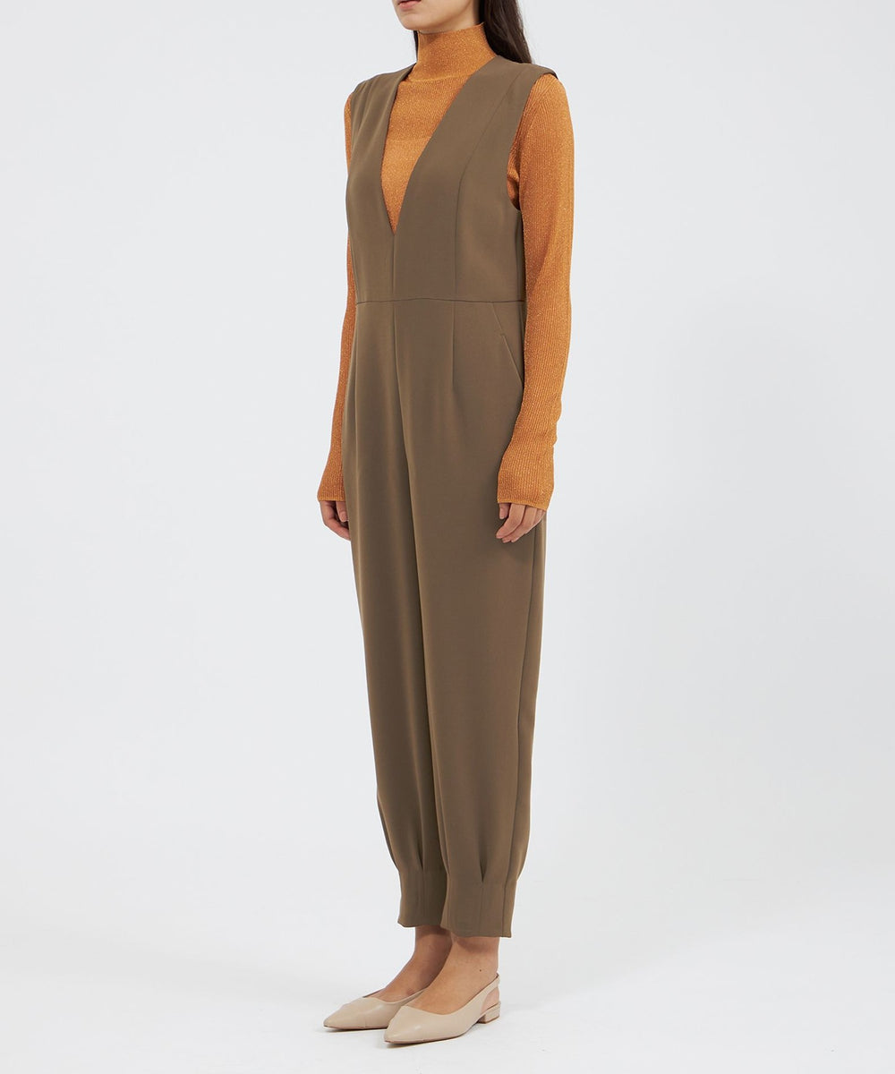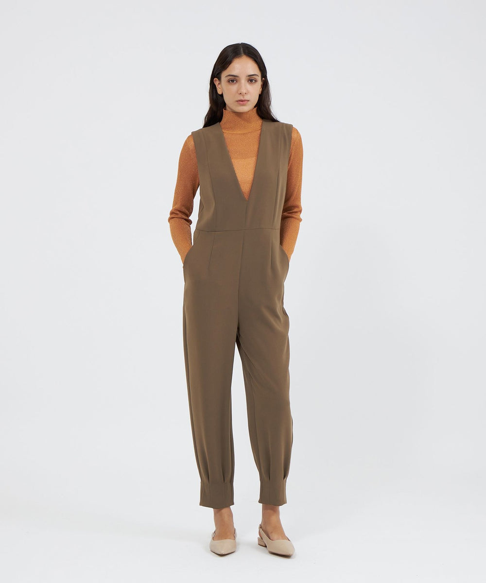 裾に施したダーツディテールがさりげないアクセントになった、テーパードシルエットのジャンプスーツです。