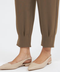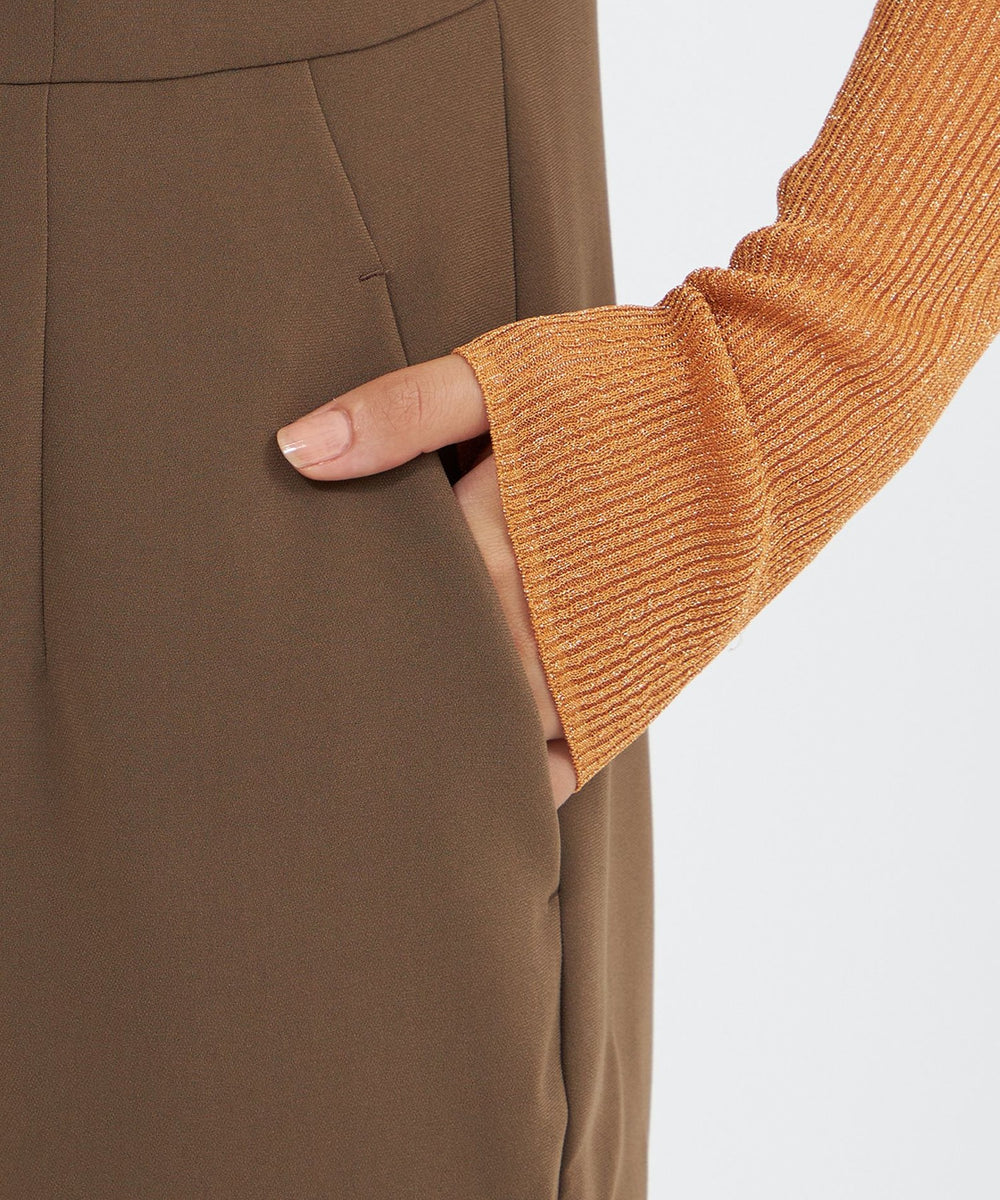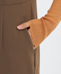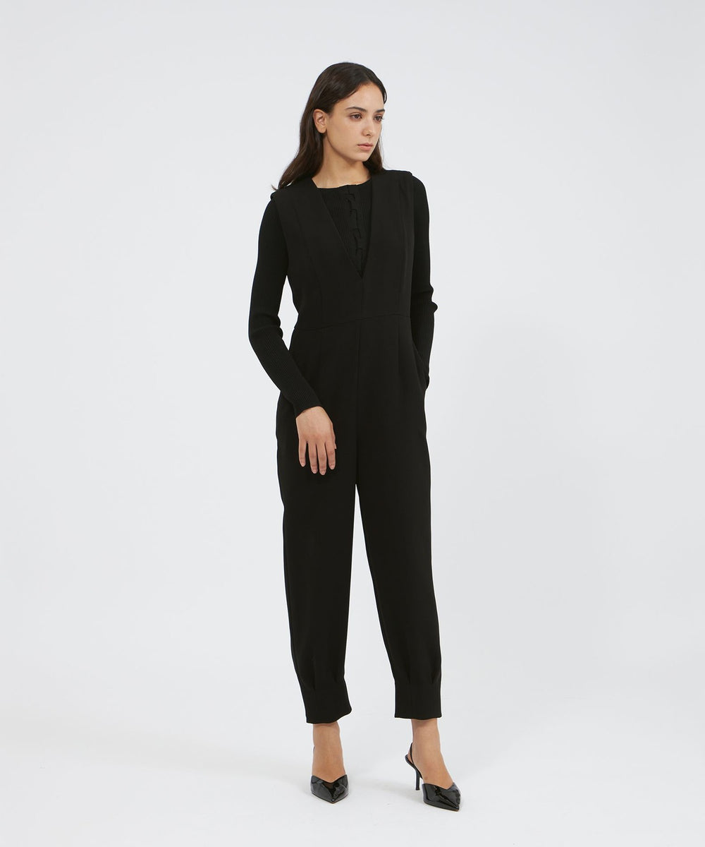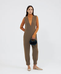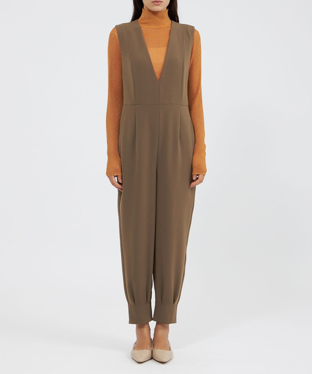 裾に施したダーツディテールがさりげないアクセントになった、テーパードシルエットのジャンプスーツです。