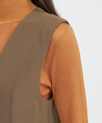 深めに開いたVネックは顔まわりをすっきりと見せ、インナーを合わせたレイヤードスタイルも楽しめます。上品さとリラックス感を兼ね備えた1着です。