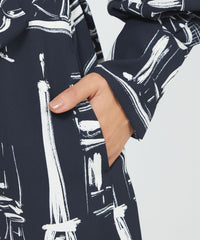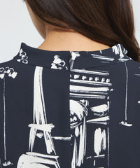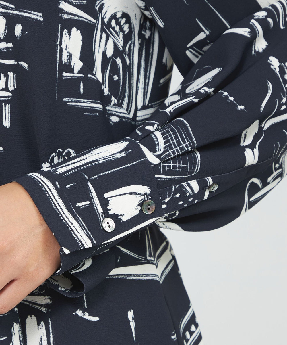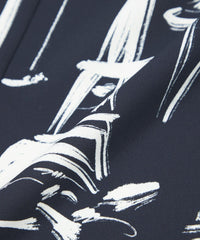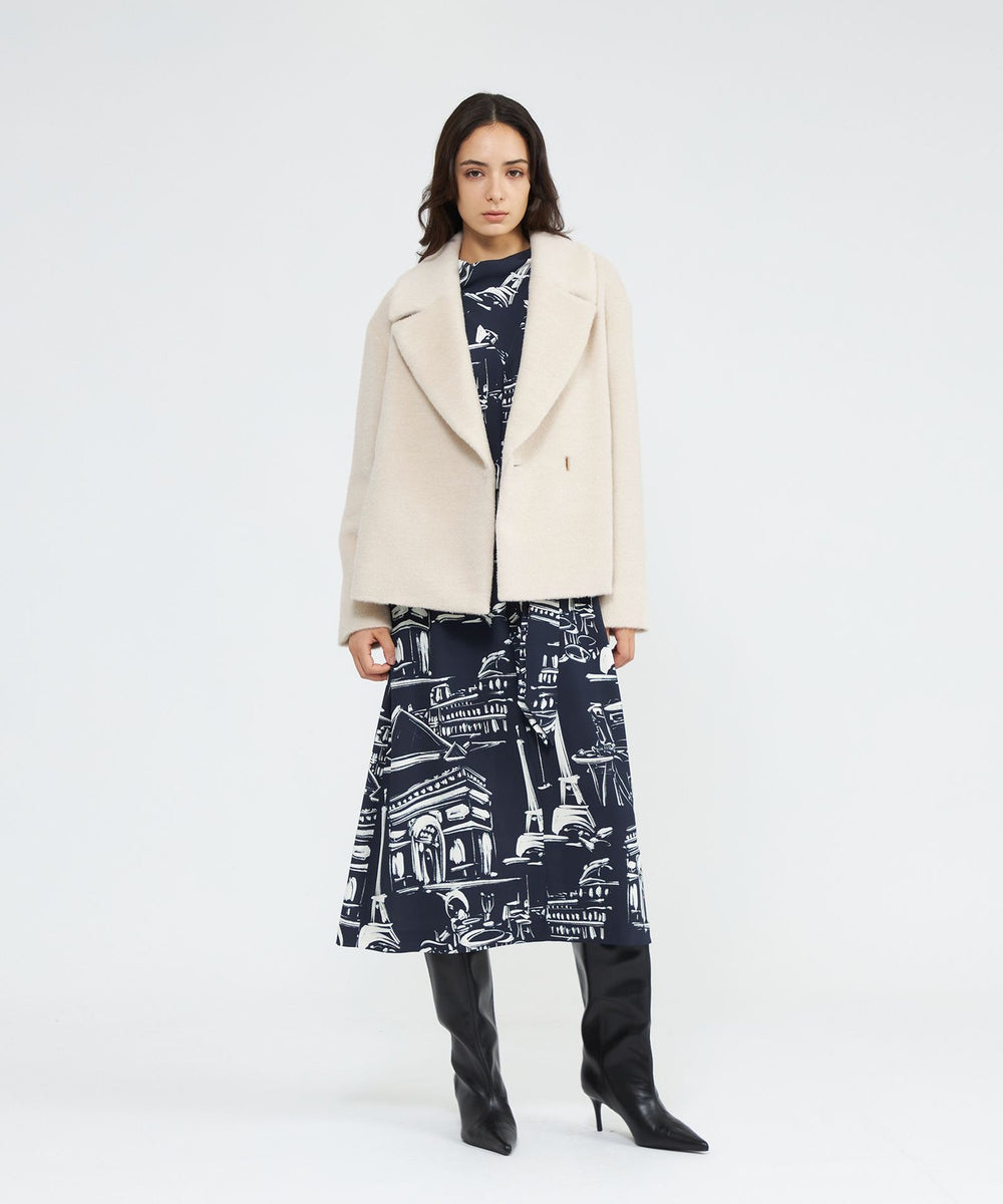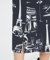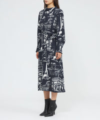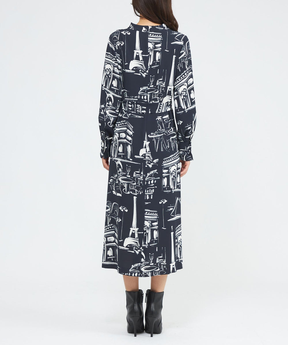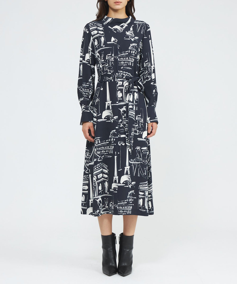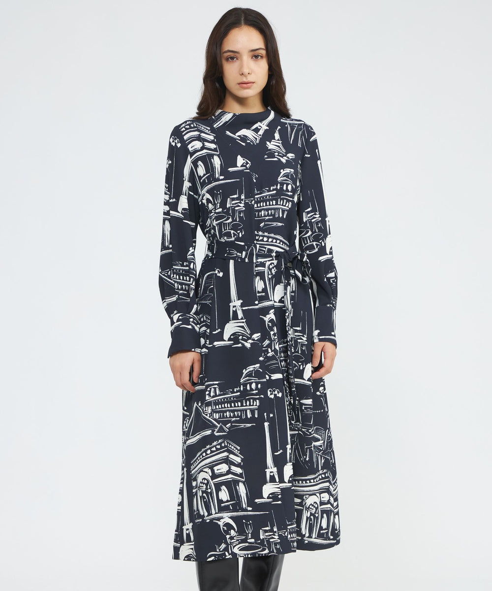 パリの風景をポップなタッチで描いたペイント風プリントです。プリントの下地の生地は、独特なシャリ感と適度なハリ・コシ、軽さとドレープ性を兼ね備えた中肉素材を使用しました。表面感があり、動きに合わせて揺れるディテールが美しく映えます。