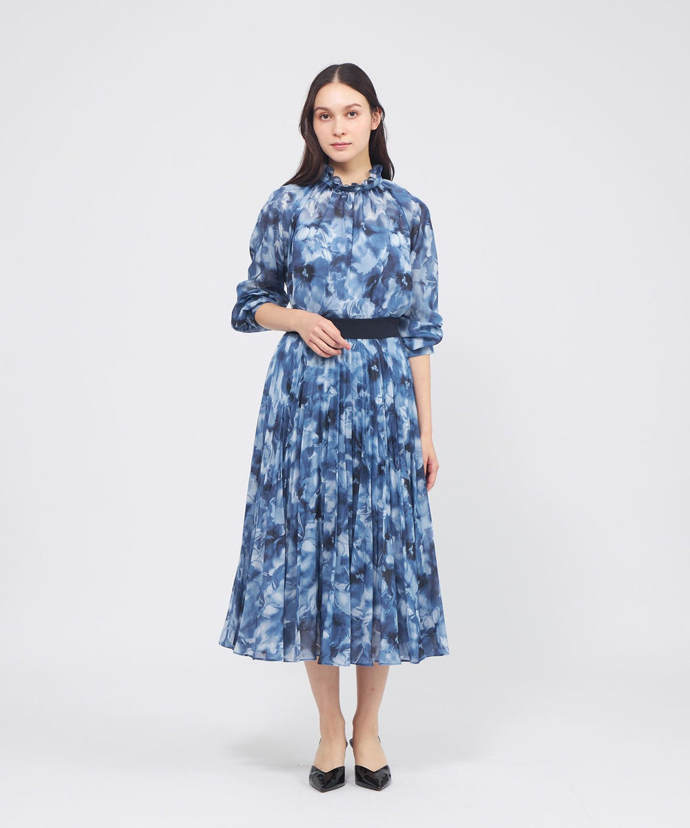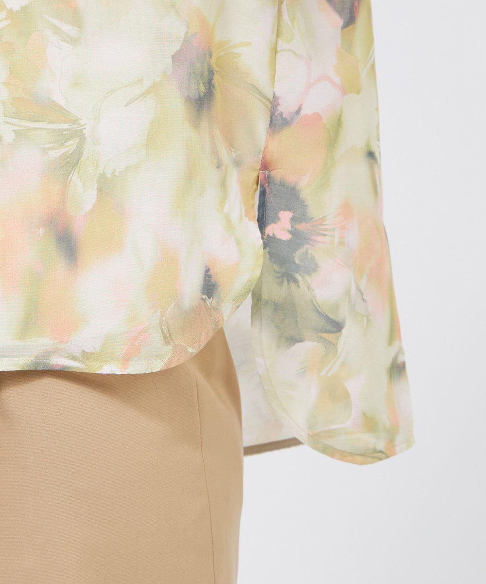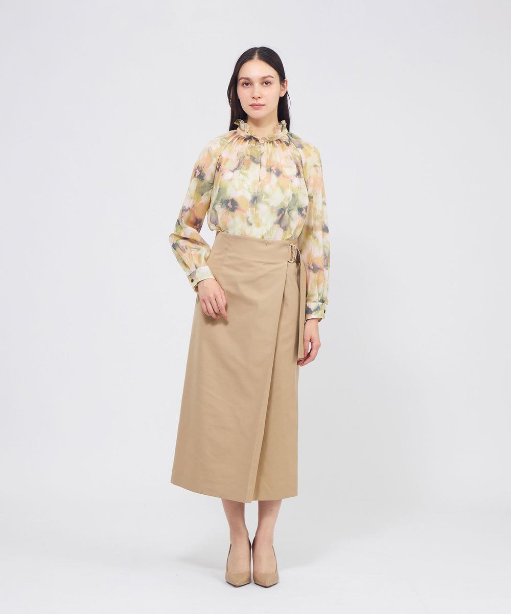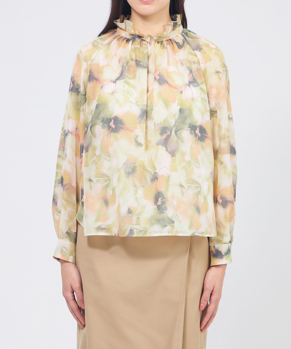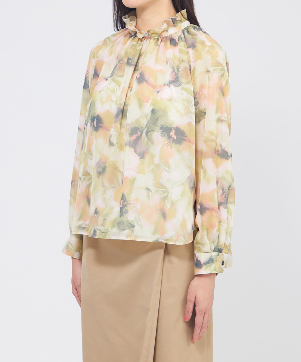 ふんわりとしたエレガントなボリューム感のフリルカラーブラウス。カラフルなプリントとギャザーによる華やかな分量感が着映えするデザインです。背中にはボタンをあしらい、バックスタイルにもアクセントをプラスしました。同素材のスカート(品番:M5S02705)とセットアップで着用いただけます。