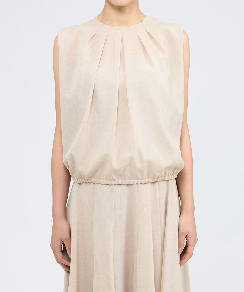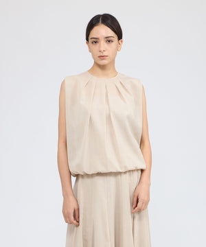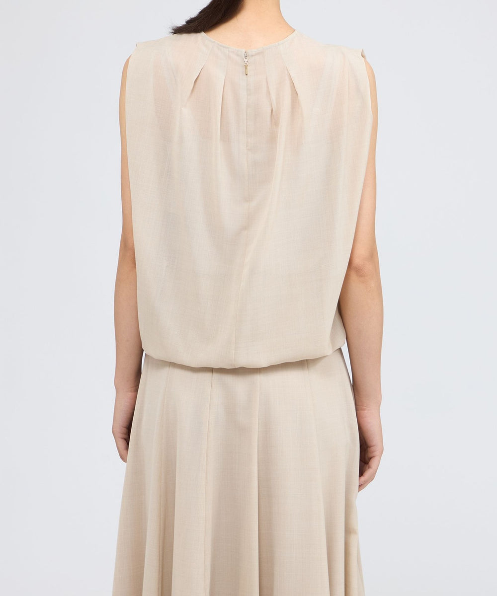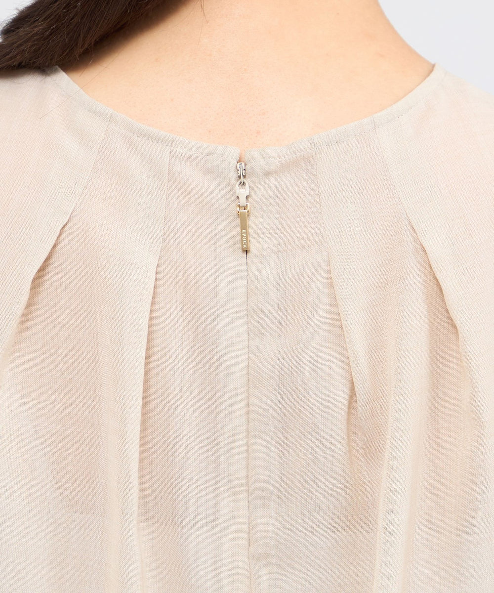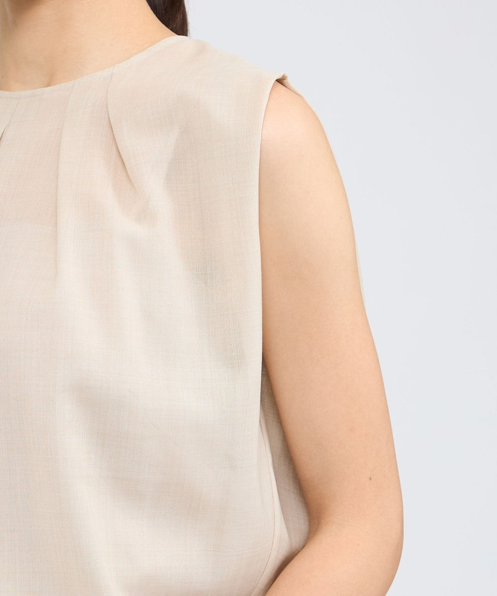 ノースリーブのインサイドショルダーブラウスです。裾のブラウジングデザインにより身体から生地が離れ、風通しの良い快適な着心地が叶います。襟元のタックが顔回りも華やかに演出します。同素材のスカート(品番:M5S23612)とセットアップでの着用もおすすめです。キャミソール付きです。