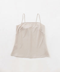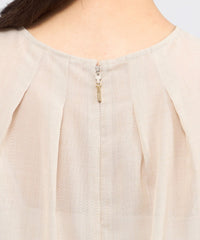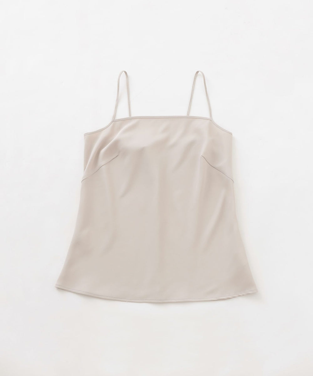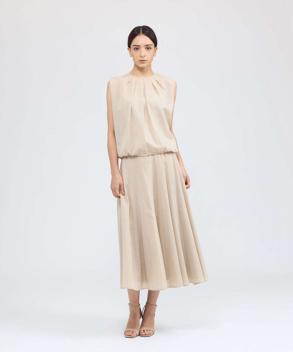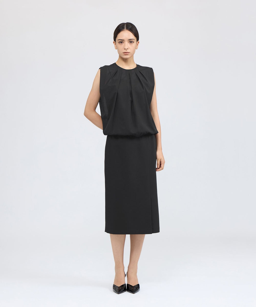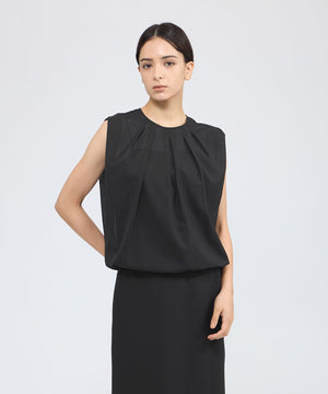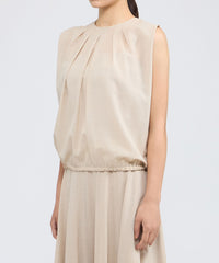 ノースリーブのインサイドショルダーブラウスです。裾のブラウジングデザインにより身体から生地が離れ、風通しの良い快適な着心地が叶います。襟元のタックが顔回りも華やかに演出します。同素材のスカート(品番:M5S23612)とセットアップでの着用もおすすめです。キャミソール付きです。