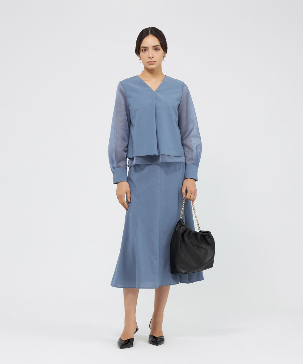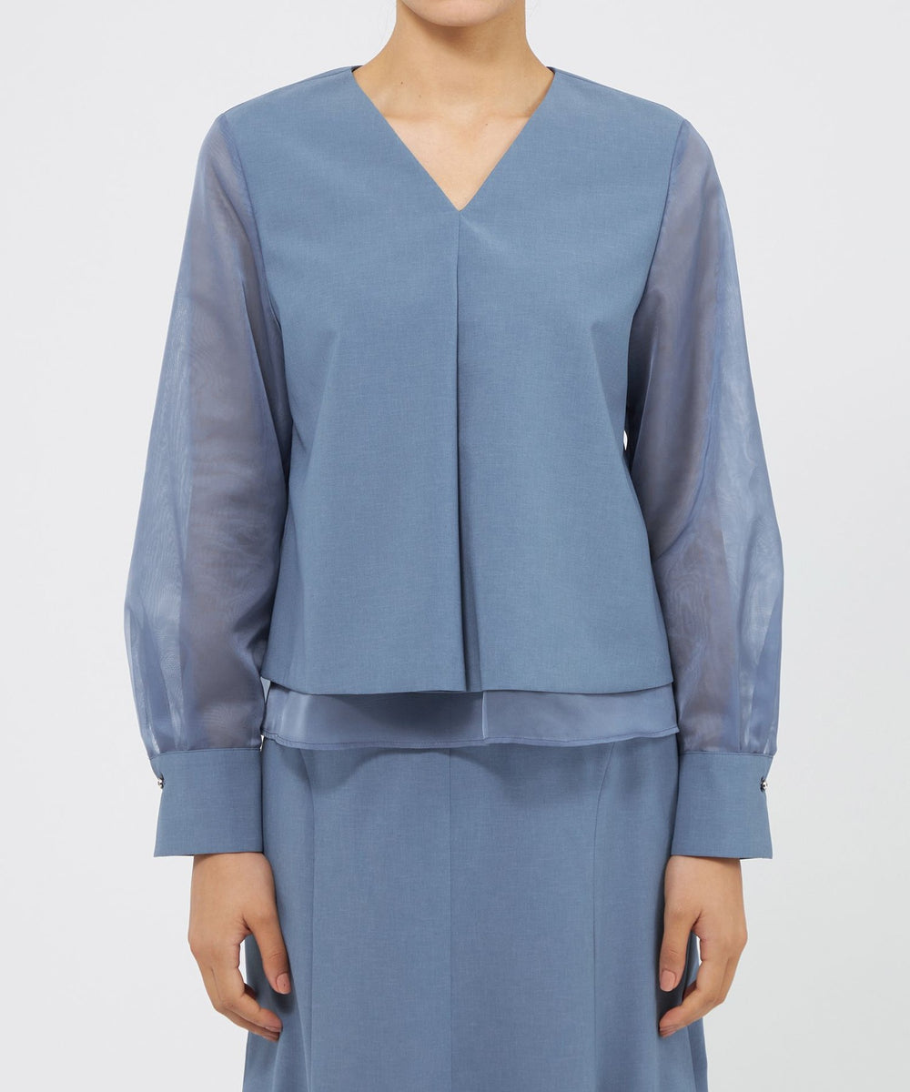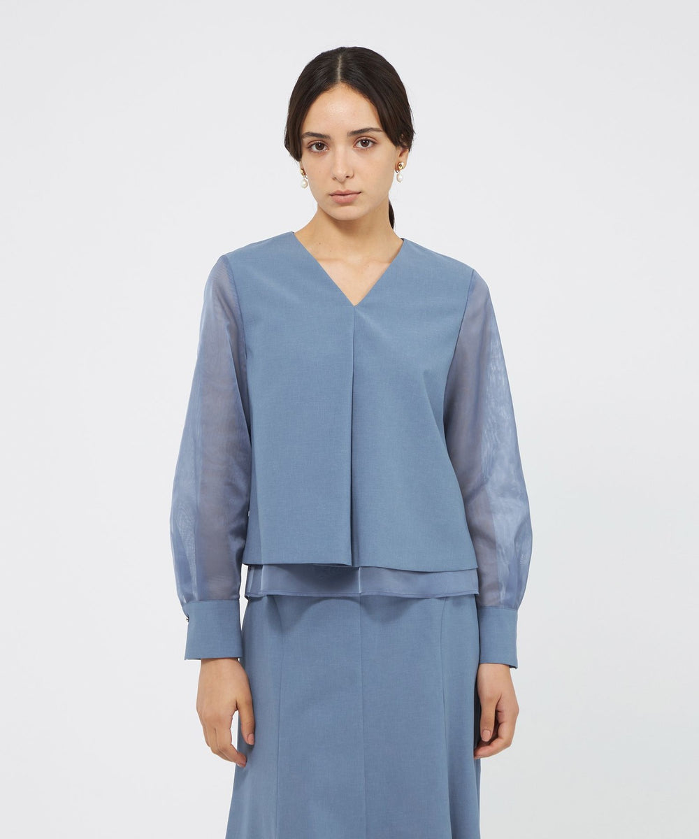 ドライタッチでありながら、程よいドレープ性と心地よい肌触りを兼ね備えた素材を使用したAラインブラウスです。シアーな袖と、裾からのぞくオーガンジーが軽やかな印象を演出します。デコルテを美しく見せるVネックラインやカフスにあしらわれたビジュー釦もさりげないアクセントに。同素材のスカート(品番:M5S27626)とセットアップでの着用もおすすめです。