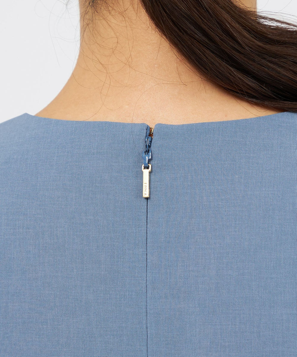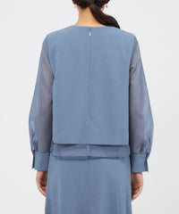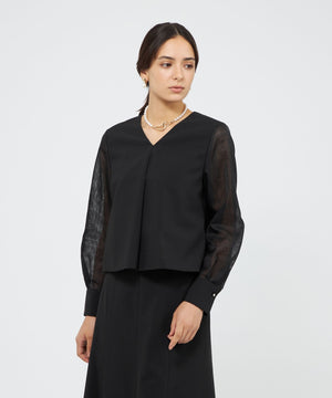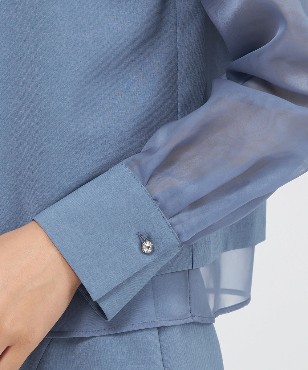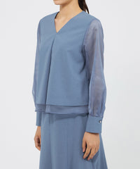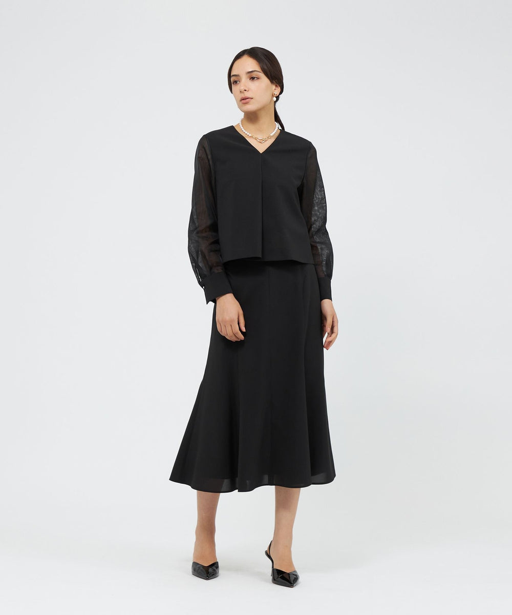 ドライタッチでありながら、程よいドレープ性と心地よい肌触りを兼ね備えた素材を使用したAラインブラウスです。シアーな袖と、裾からのぞくオーガンジーが軽やかな印象を演出します。デコルテを美しく見せるVネックラインやカフスにあしらわれたビジュー釦もさりげないアクセントに。同素材のスカート(品番:M5S27626)とセットアップでの着用もおすすめです。