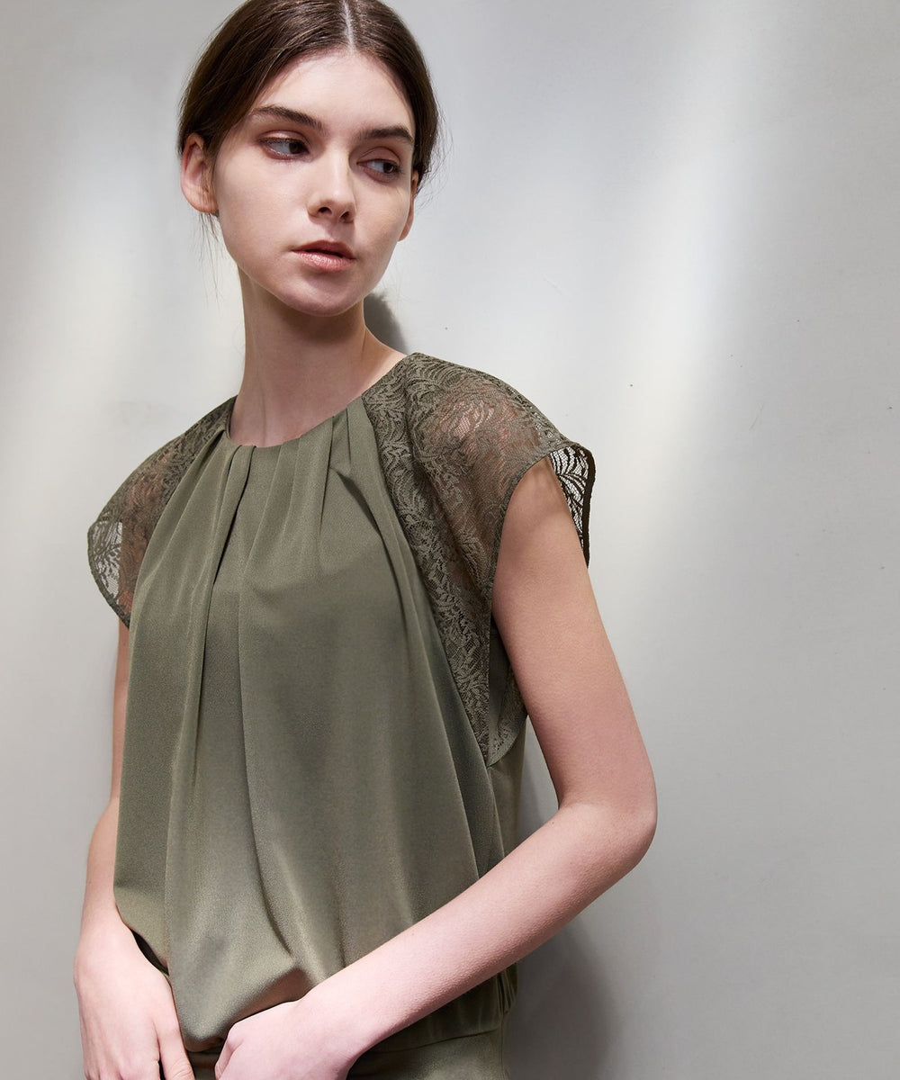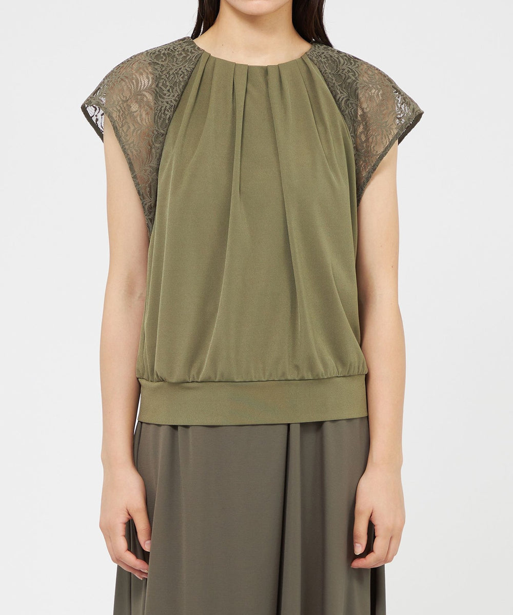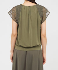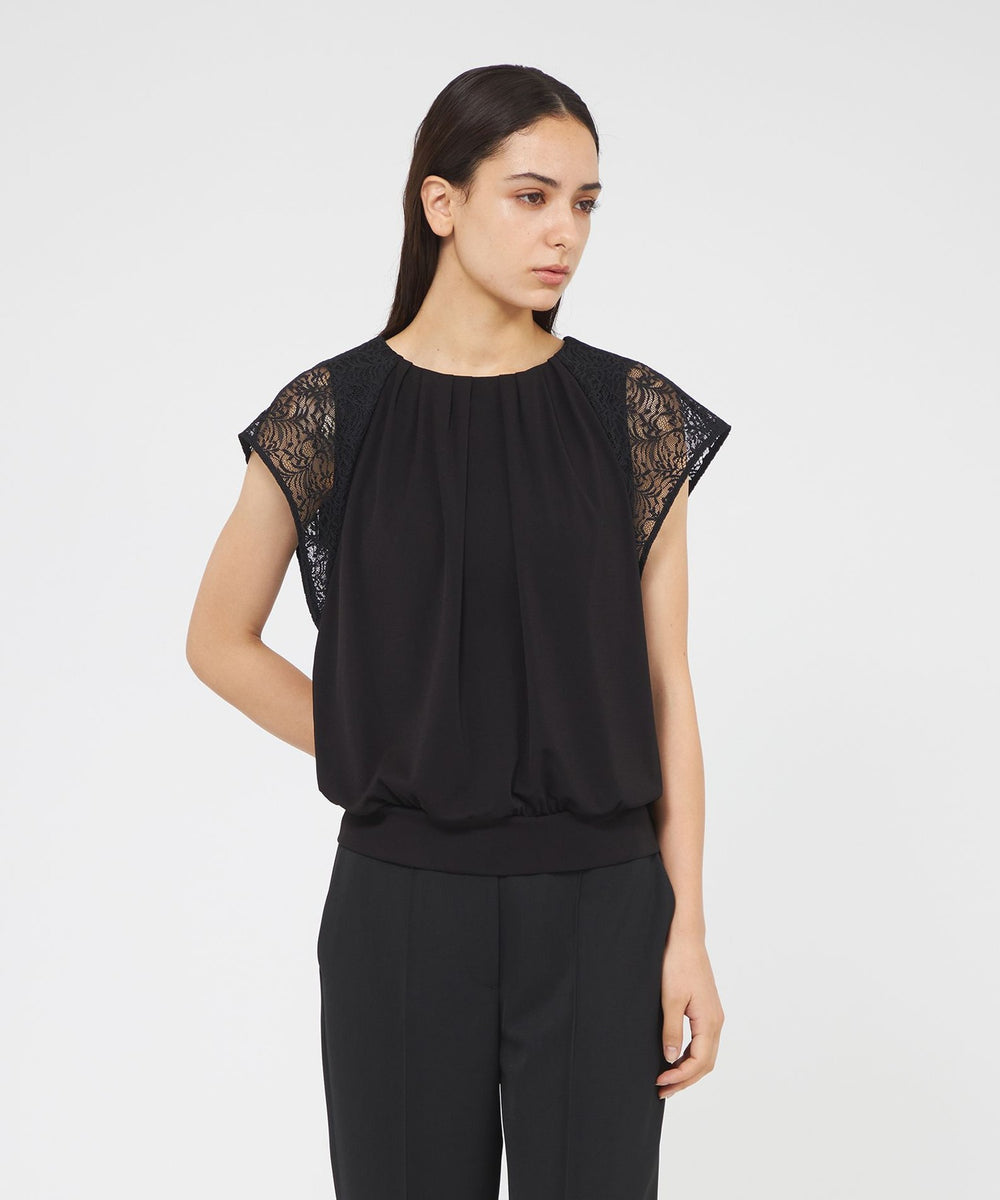 ラグランスリーブのレースコンビプルオーバーです。襟ぐりのタックが素材とマッチしたエレガントな表情です。裾は太幅で切り替えデザインにメリハリをつけました。ウエストで止まるのでブラウジングをしているような自然な落ち感が出るのもポイントです。同素材のパンツ(品番:M5R23568)の展開もございます。