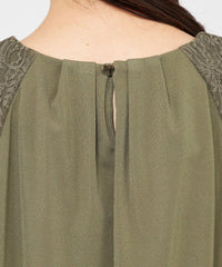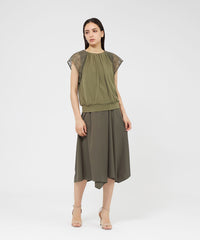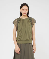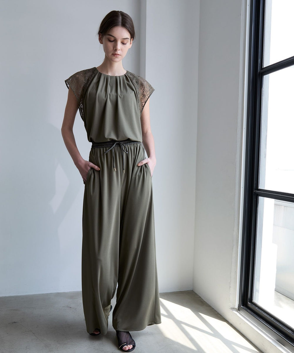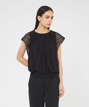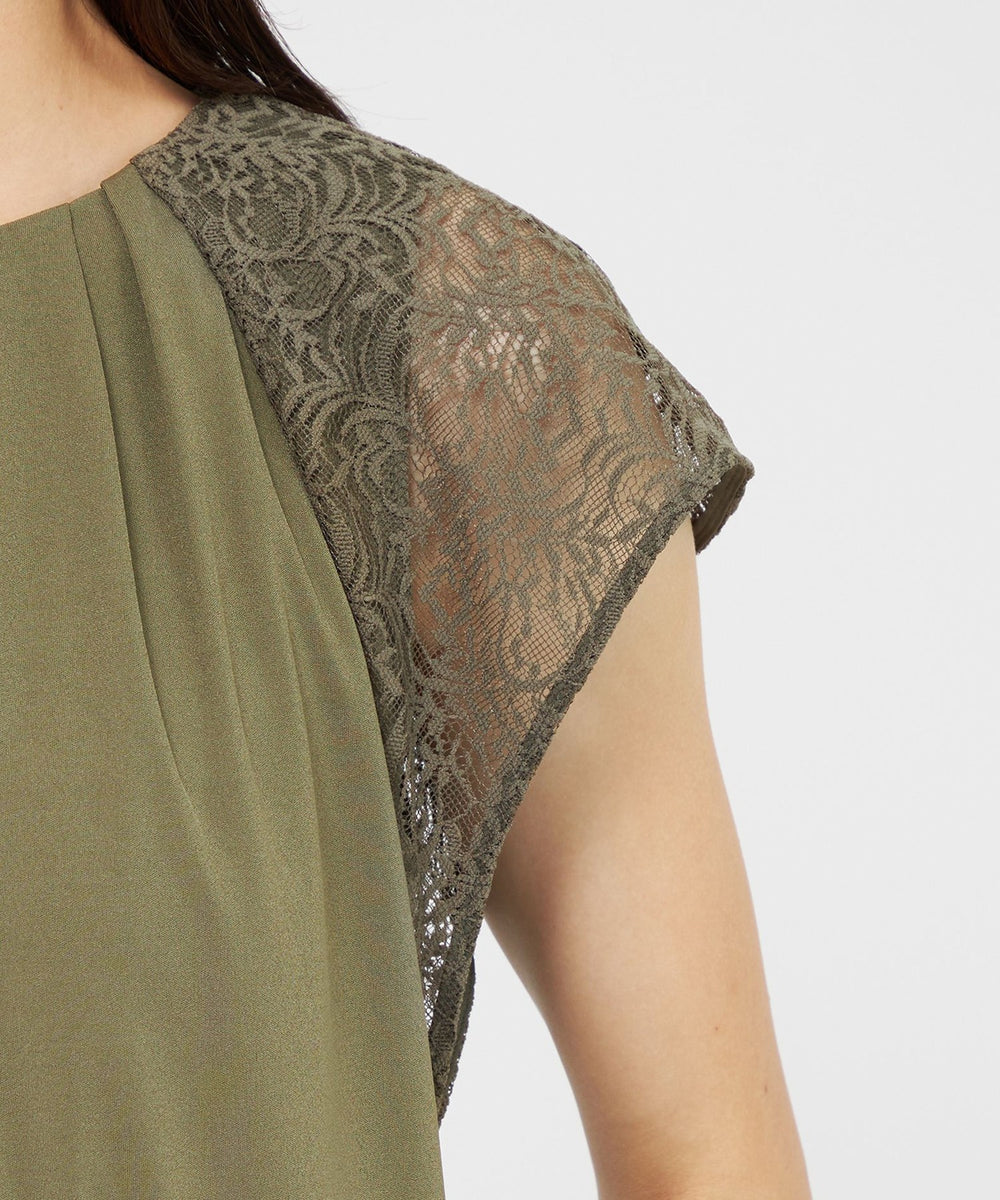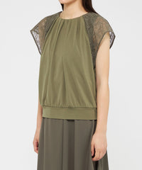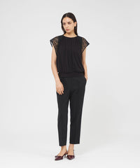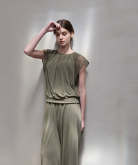 ラグランスリーブのレースコンビプルオーバーです。襟ぐりのタックが素材とマッチしたエレガントな表情です。裾は太幅で切り替えデザインにメリハリをつけました。ウエストで止まるのでブラウジングをしているような自然な落ち感が出るのもポイントです。同素材のパンツ(品番:M5R23568)の展開もございます。
