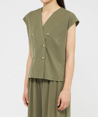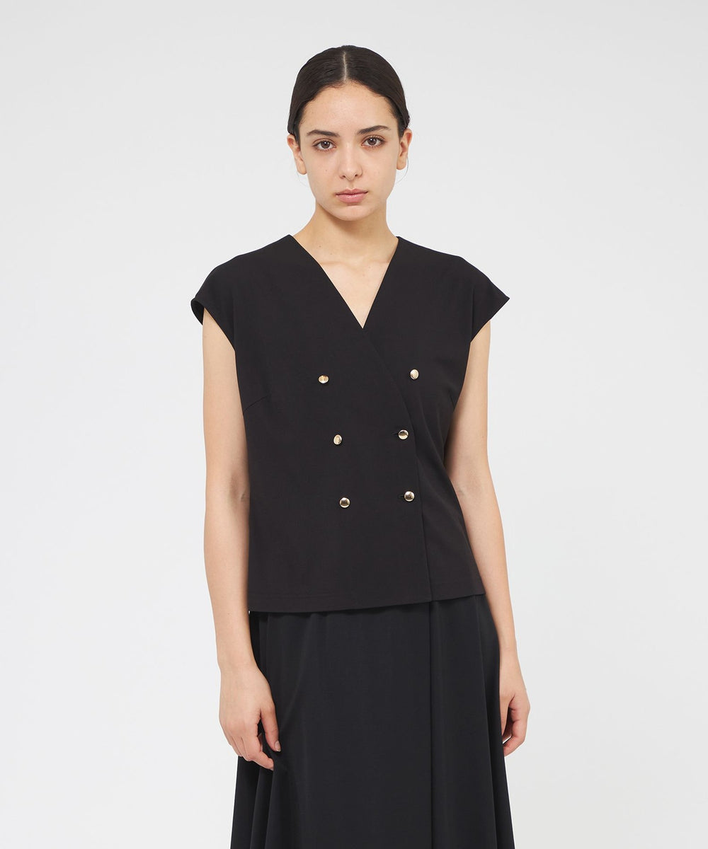 トレンド感のあるダブルブレストのコンパクトジレです。シルエットはフレンチスリーブでコンパクトに、華奢な金ボタンでアクセントを加えました。コーディネートにプラスすることでこなれ感が出る1着です。同素材のパンツ(品番:M5R23568)とのコーディネートがおすすめです。
