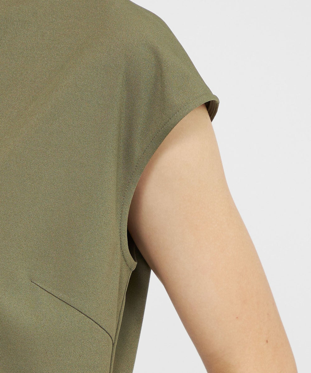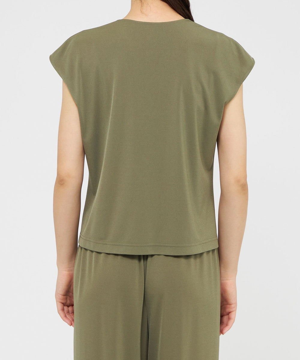 トリアセテートの複合糸を強撚にし、サラッとしたタッチに仕上げたジャージー素材です。コンパクトな目面が上品で、ドレープ性が美しいシルエットを作ります。ジャージー素材ならではのストレッチ性やイージーケア性もポイントです。接触冷感の機能が付いており暑い時期にも快適に着用いただけます。