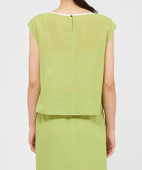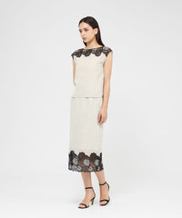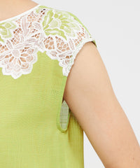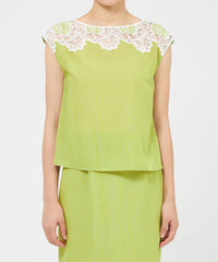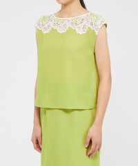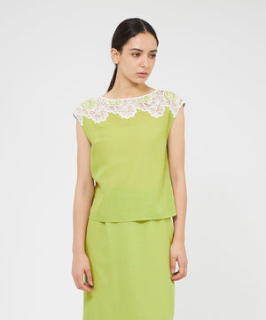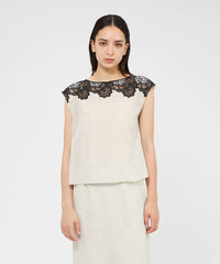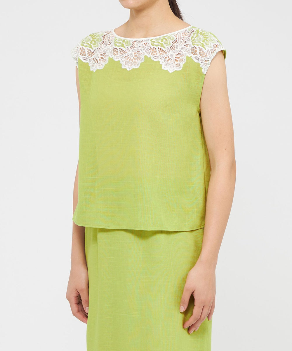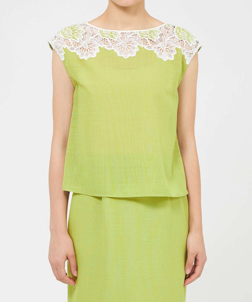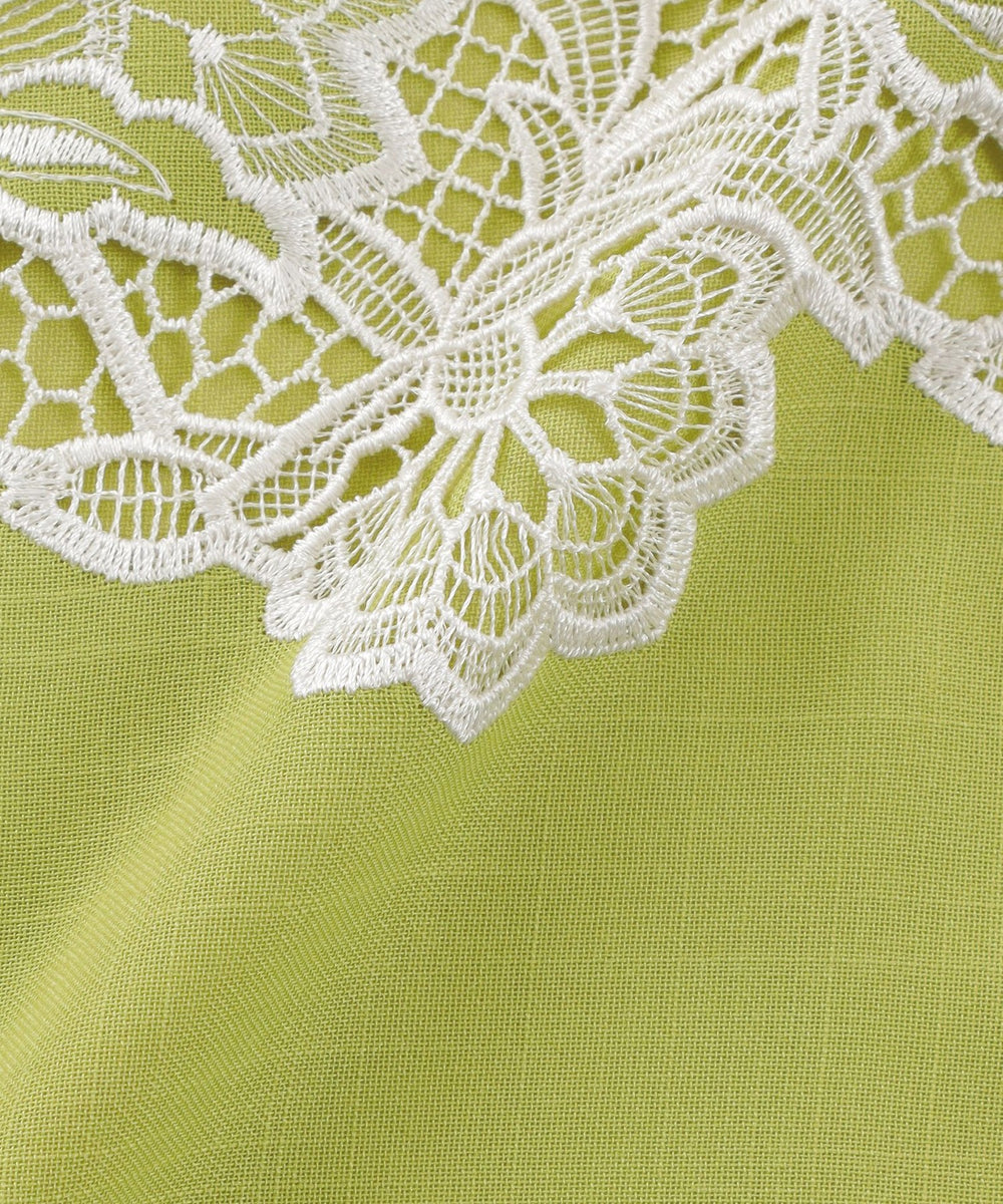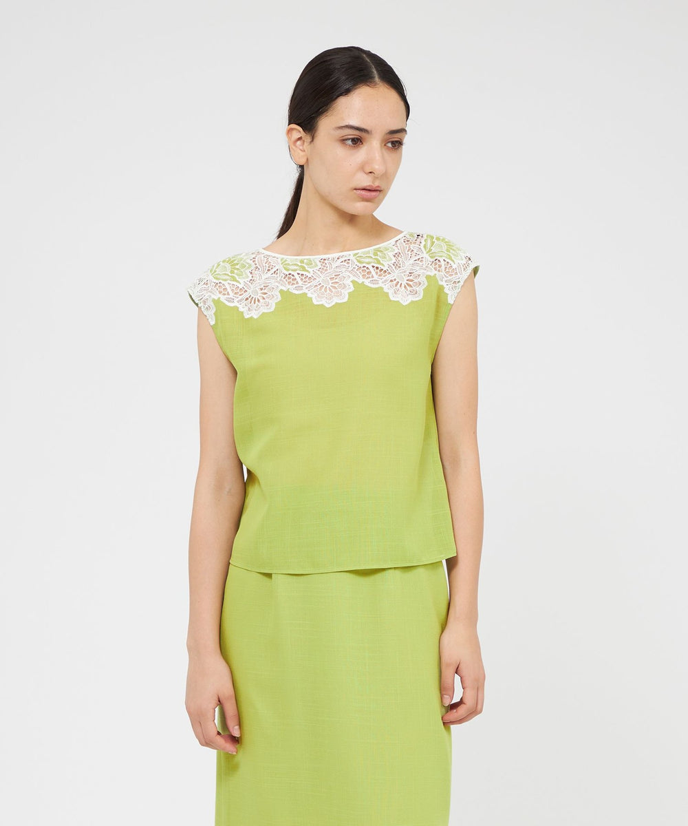 ケミカルレースを前身頃に施したフレンチスリーブのブラウスです。レースデザインが顔まわりを華やかに演出します。素材の表情が活きるよう、また同素材のスカート(品番:M5S37569)とセットアップで着用いただけるよう、デザインはミニマルに仕上げています。