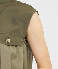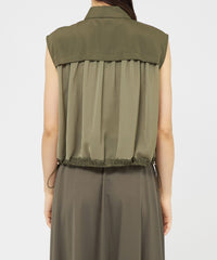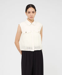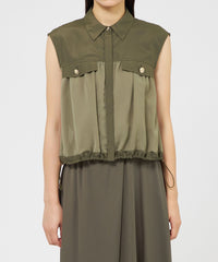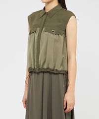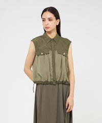 異素材をコンビしたデザインクロップドシャツです。胸ポケットのディテールがポイントです。裾のドロストでシルエット変化が楽しめる1着です。同色のインナーを付けているので羽織としても着回し可能です。同展開のコンパクトジャージーフレアスカート(品番:M5S40576)との合わせがおすすめです。