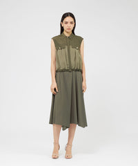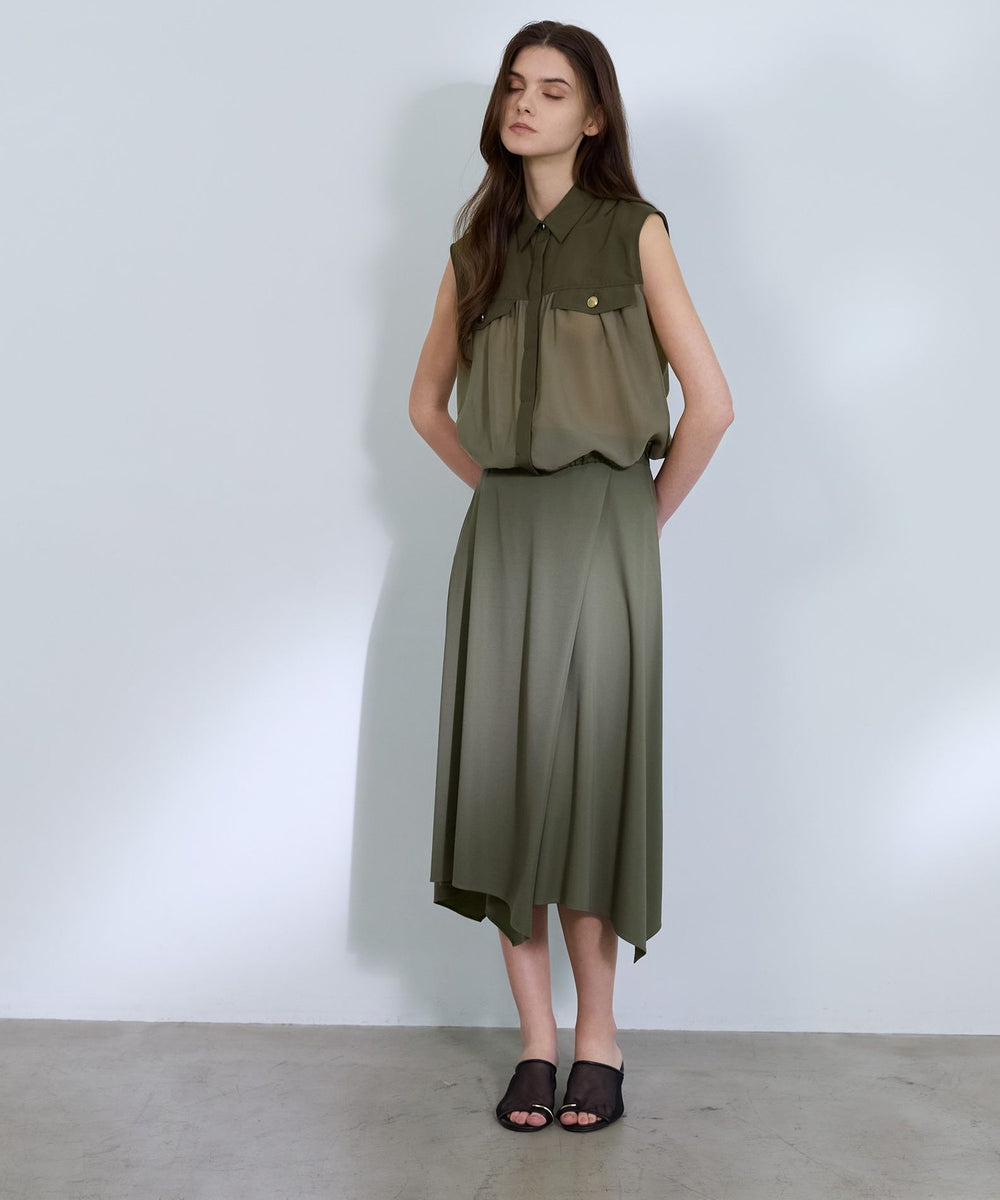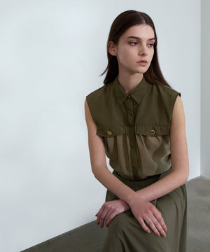 本体にはソフトで軽やかなシアーオーガンジーをドッキングしました。※熱に弱い素材のため、アイロンの温度にご注意ください。高音を当てると熱で溶ける恐れがあります。別布には天然タッチでソフトな肌触りのポリエステルスパンローンを使用しました。薄手の肉感、ドレープも綺麗に表現可能な素材です。