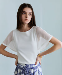 袖のみメッシュのデザイン、身頃にメッシュのケープを重ねたデザイン、と2パターンの着回しを楽しんでいただけます。着回しがきくように身頃のシルエットはシンプルにリブ編みで仕上げました。