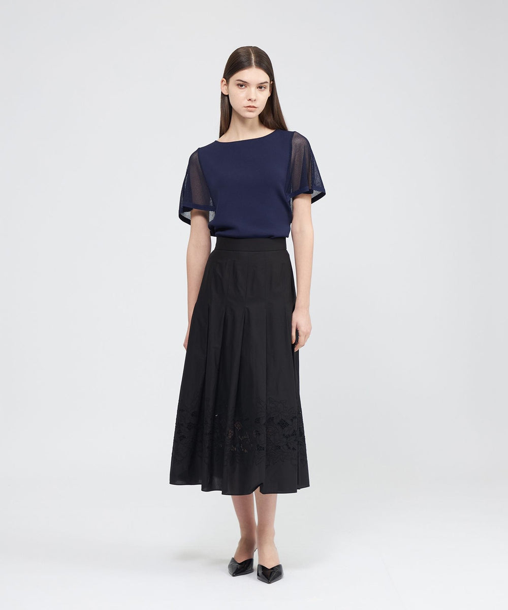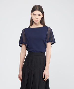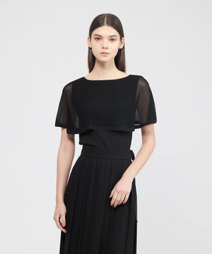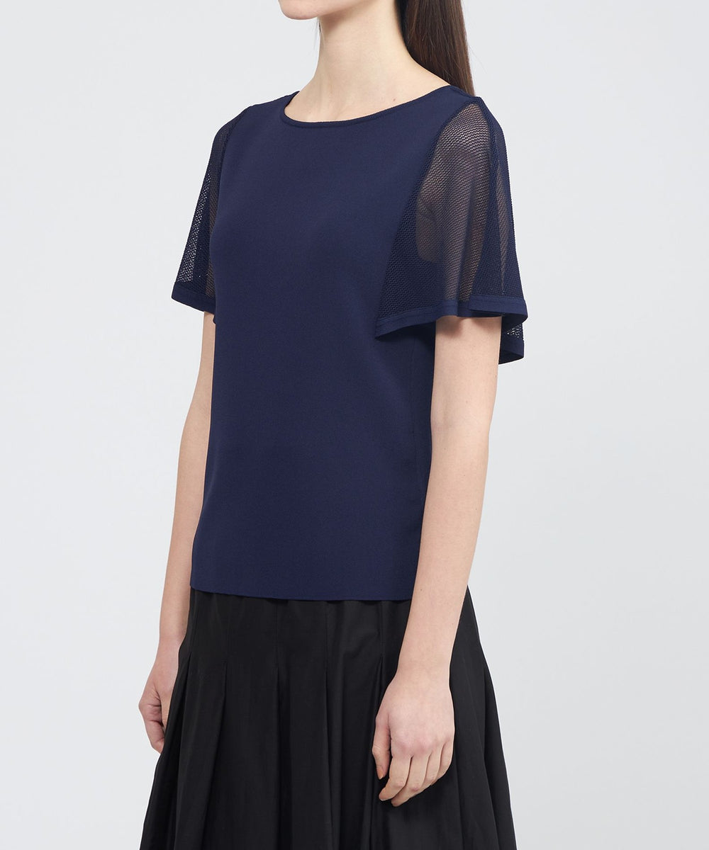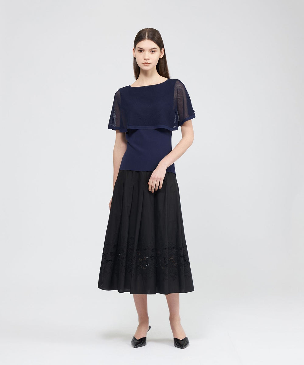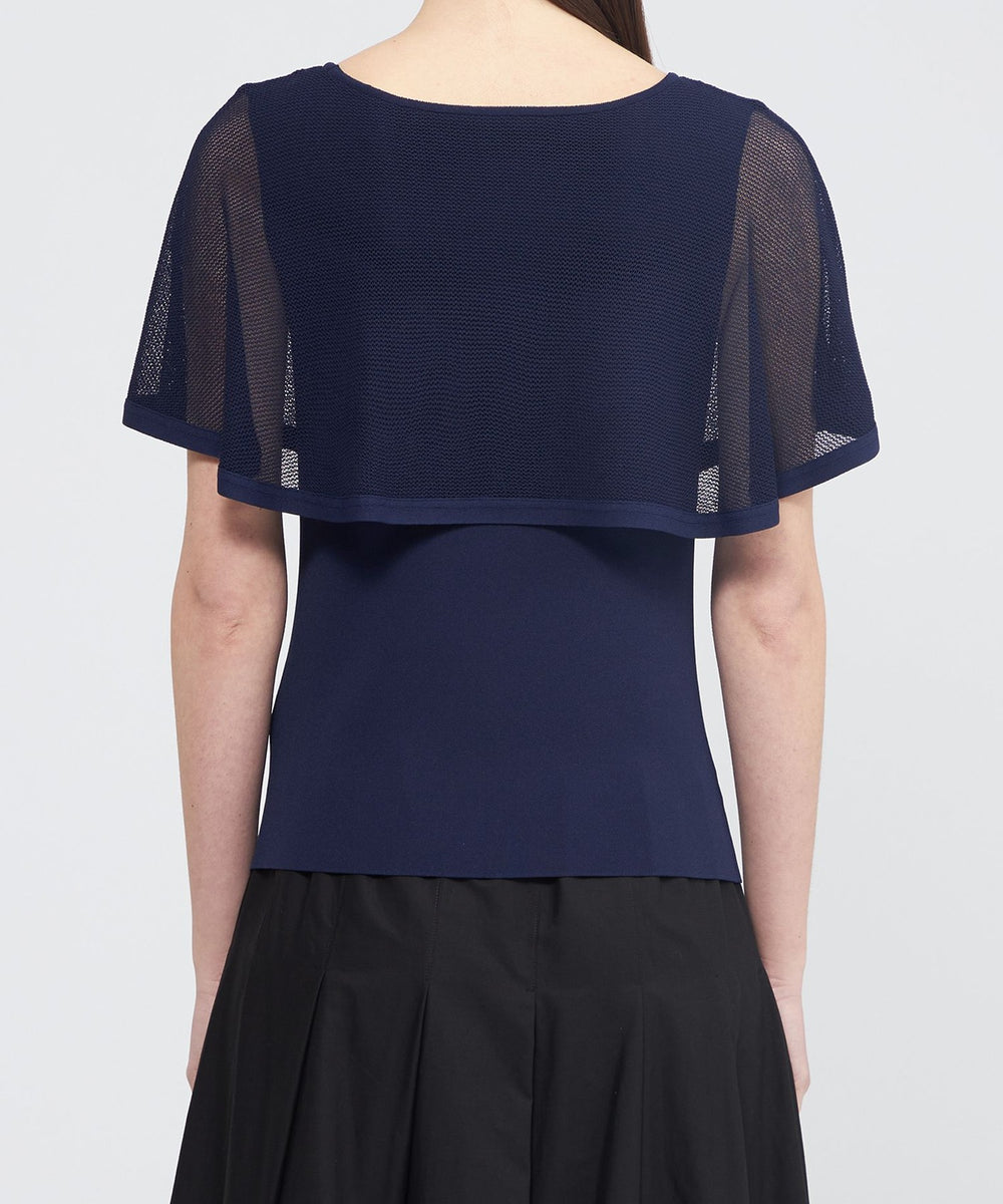 袖のみメッシュのデザイン、身頃にメッシュのケープを重ねたデザイン、と2パターンの着回しを楽しんでいただけます。着回しがきくように身頃のシルエットはシンプルにリブ編みで仕上げました。