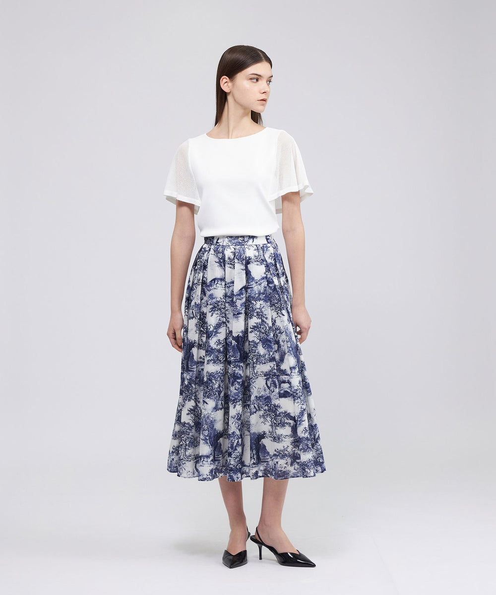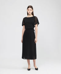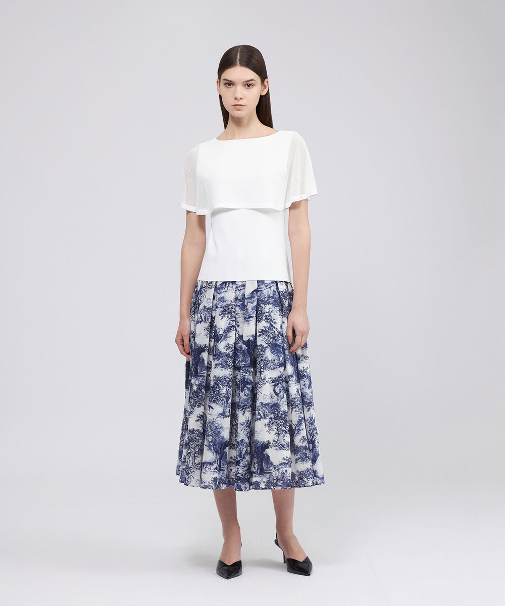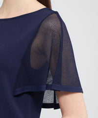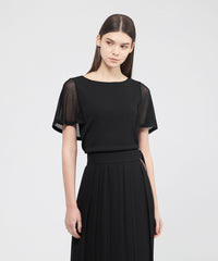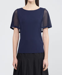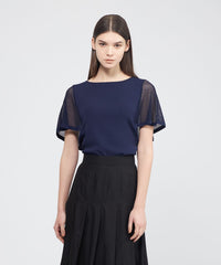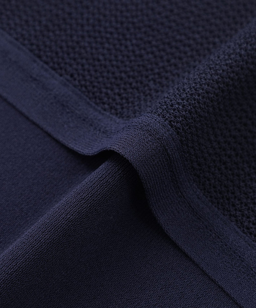 袖のみメッシュのデザイン、身頃にメッシュのケープを重ねたデザイン、と2パターンの着回しを楽しんでいただけます。着回しがきくように身頃のシルエットはシンプルにリブ編みで仕上げました。