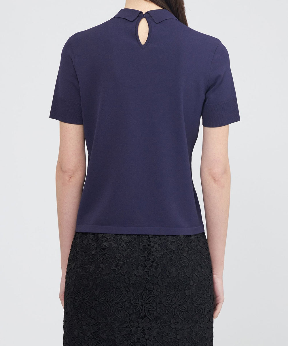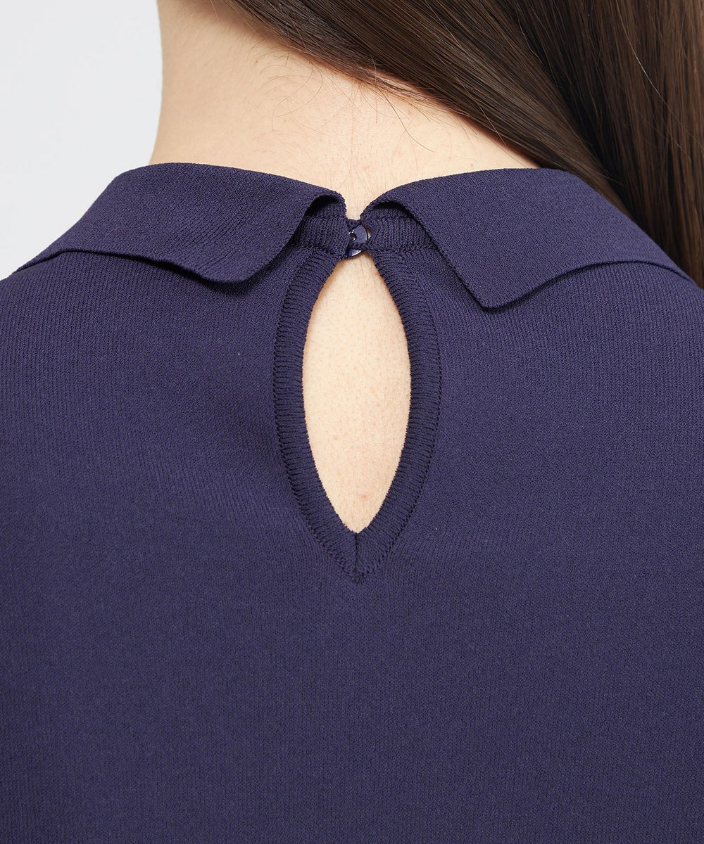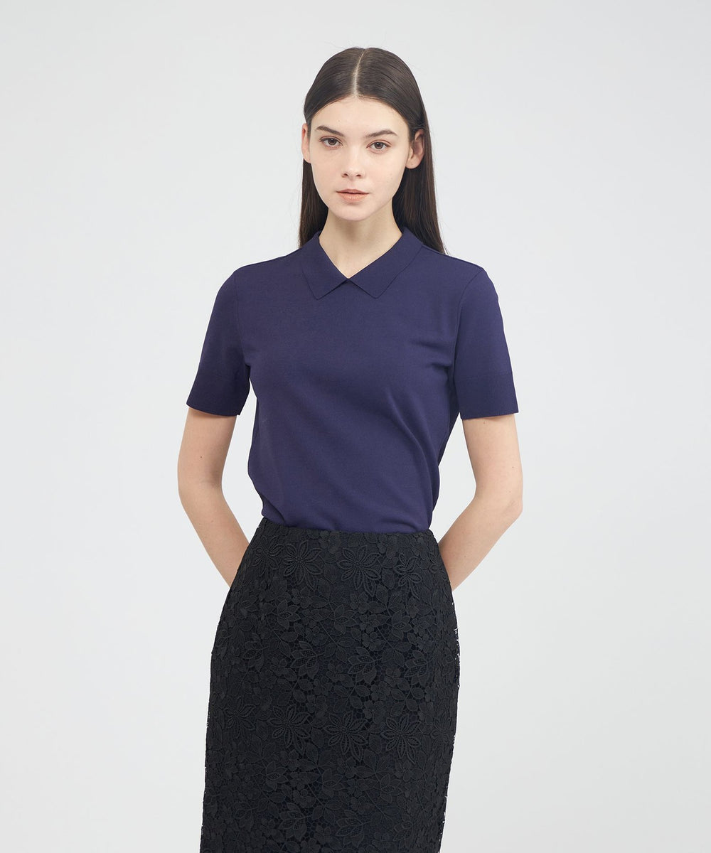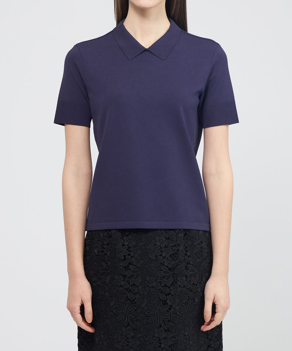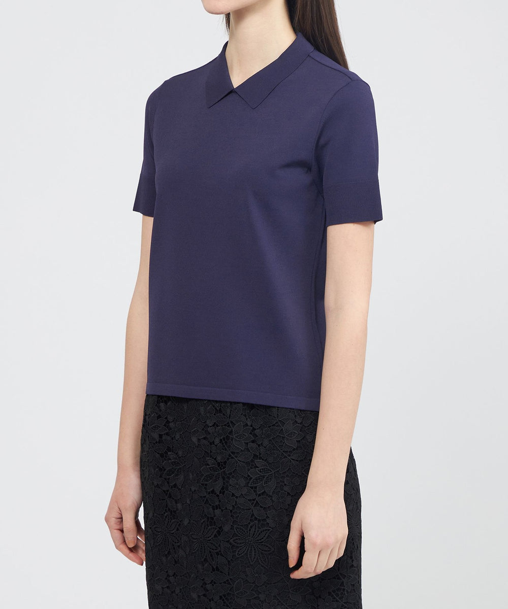 襟付きの半袖のシンプルプルオーバーです。シルエットはベーシックかつコンパクトに仕上げ、小ぶりのポロカラーで上品な印象を加えました。同素材のカーディガン(品番:M5N32553)とアンサンブルでの着用がおすすめです。