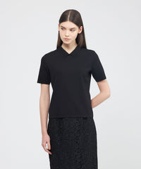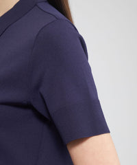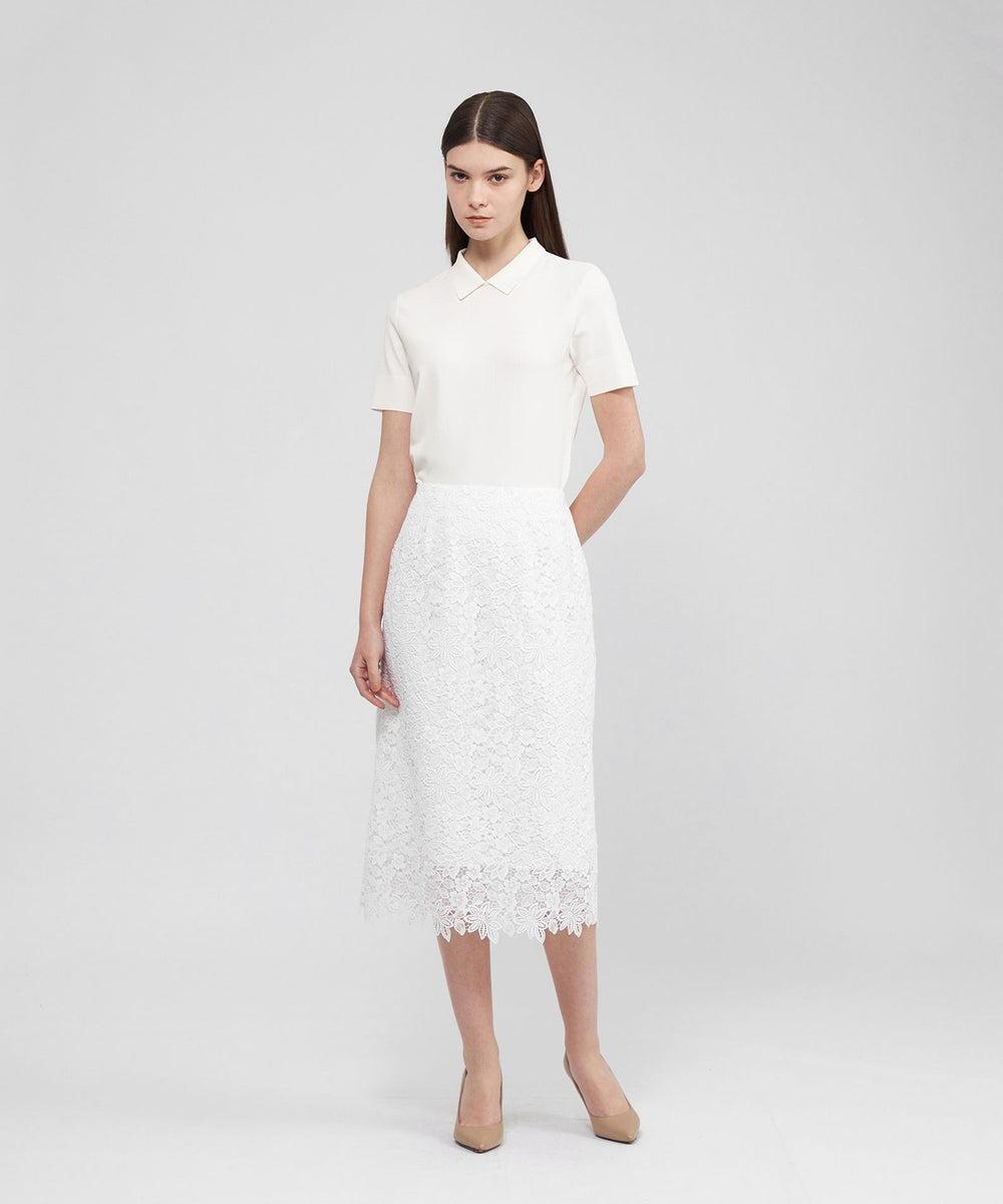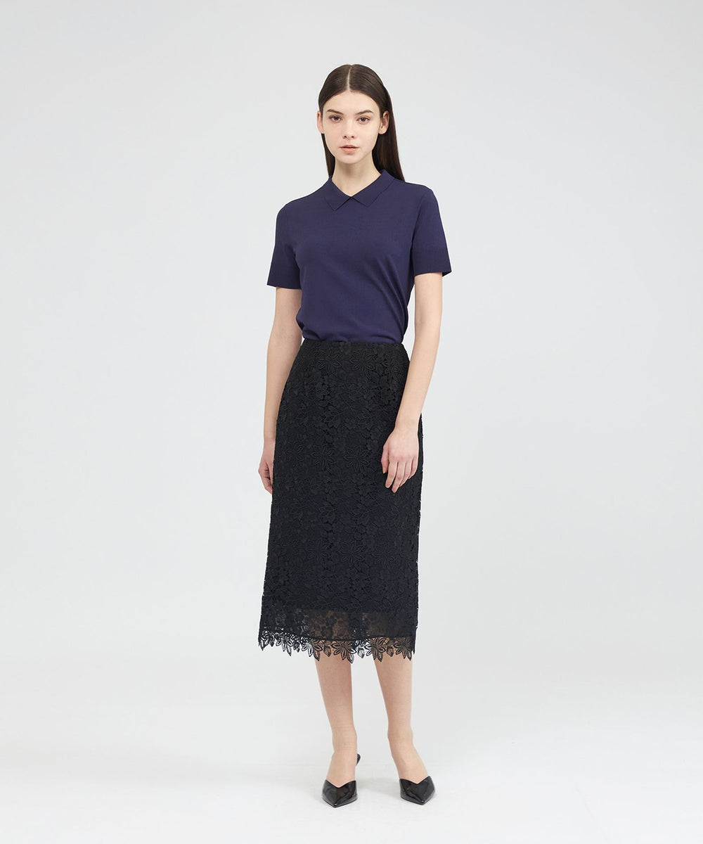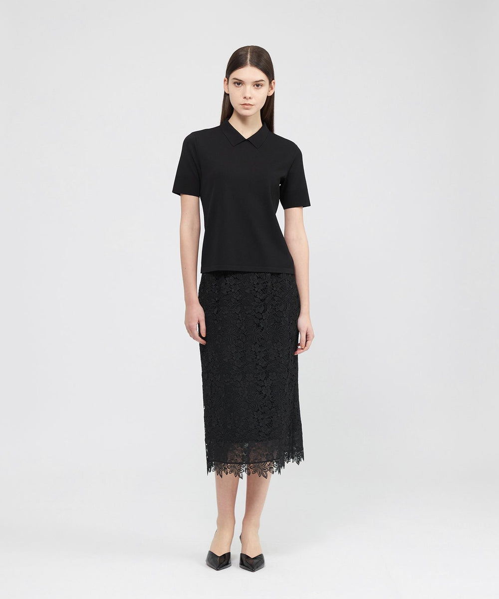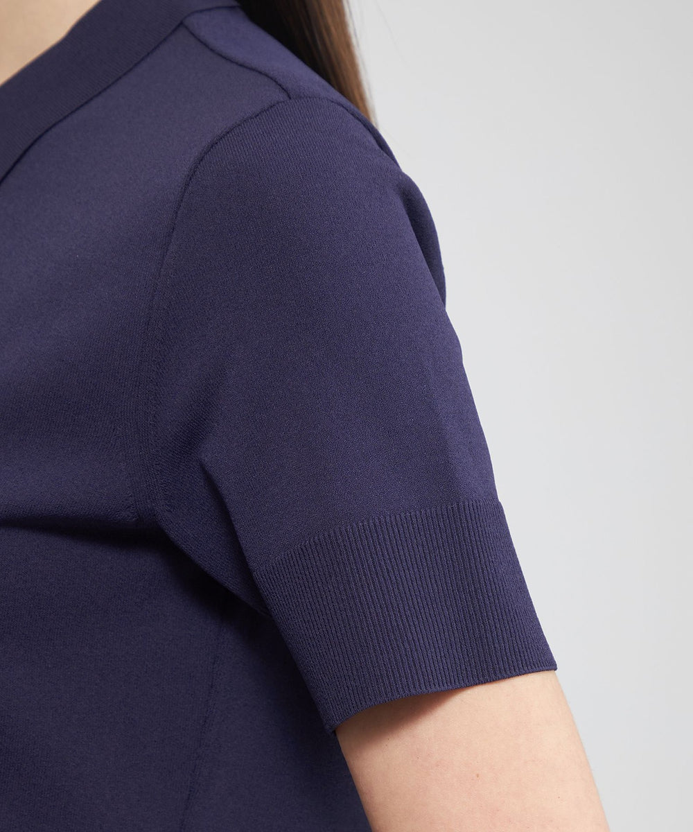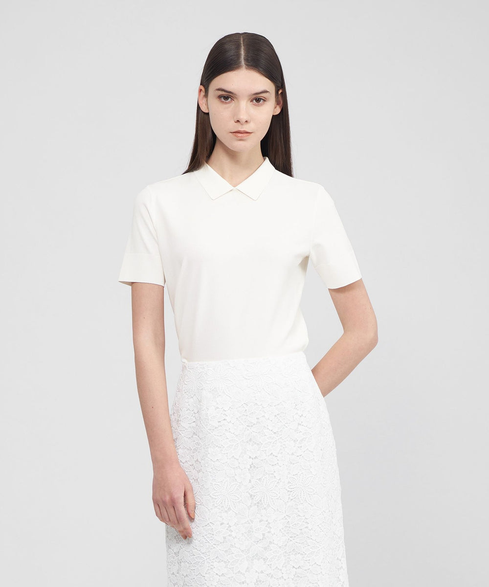 襟付きの半袖のシンプルプルオーバーです。シルエットはベーシックかつコンパクトに仕上げ、小ぶりのポロカラーで上品な印象を加えました。同素材のカーディガン(品番:M5N32553)とアンサンブルでの着用がおすすめです。