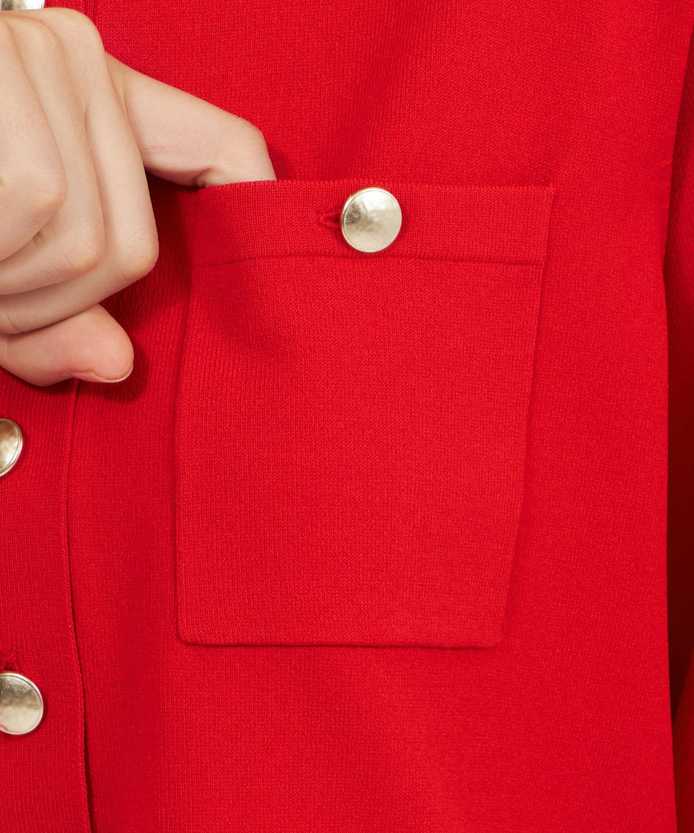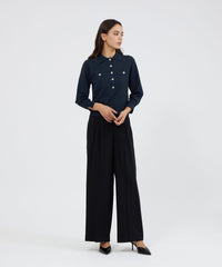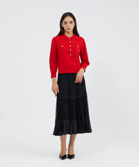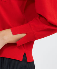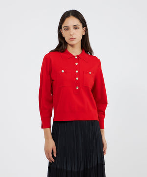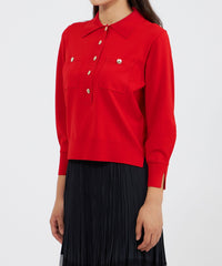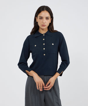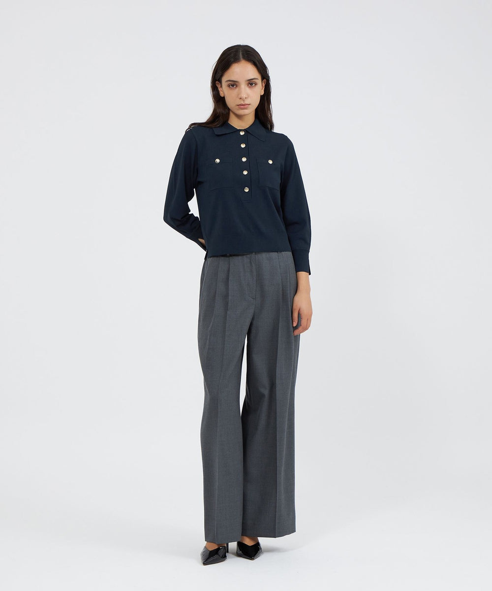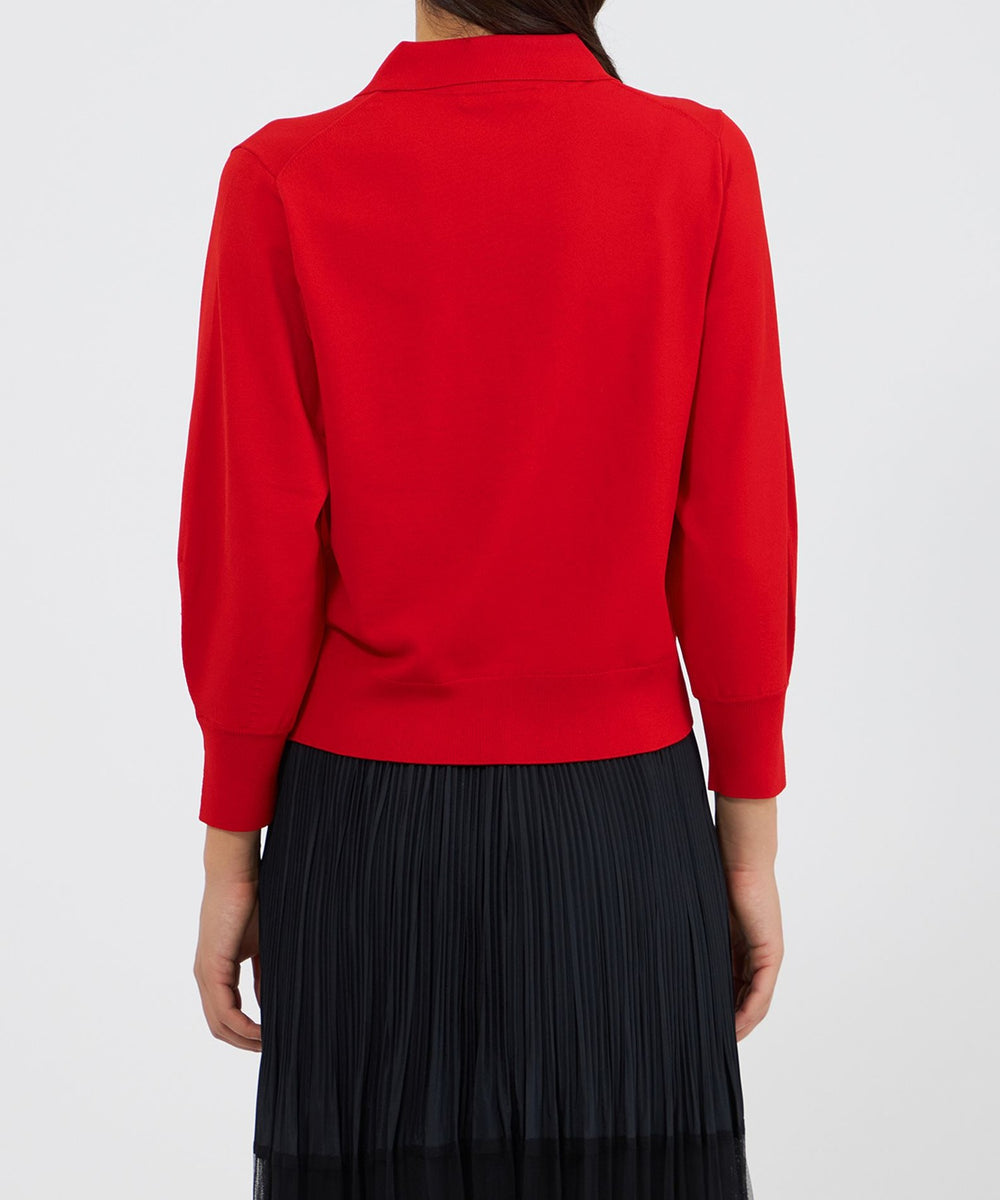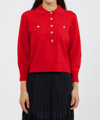 袖のシルエットが美しい、ポロ襟のショート丈ニットです。袖には増やし目のテクニックを取り入れ、ふんわりとした丸みのあるラインを表現しました。今年らしい襟付きデザインに、上品な金ボタンがエレガントなアクセントとなっています。ボトムスを選ばず、デイリーからきれいめスタイルまで幅広く活躍します。