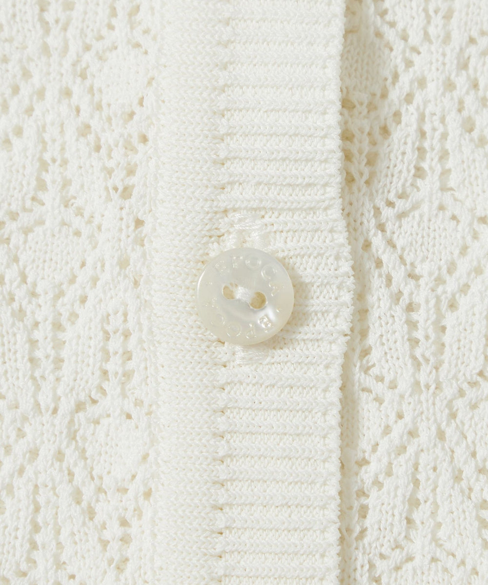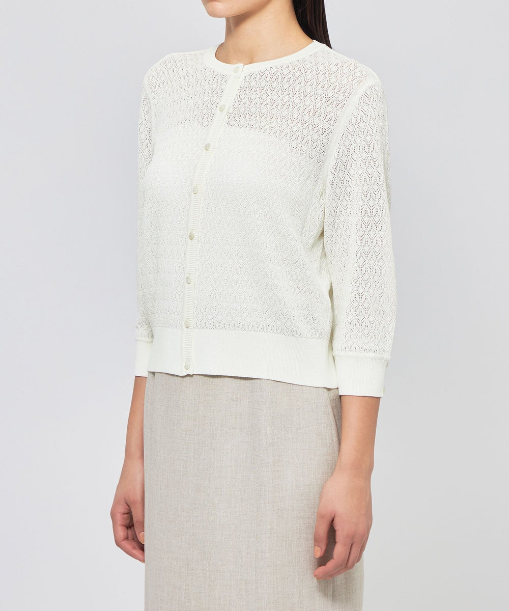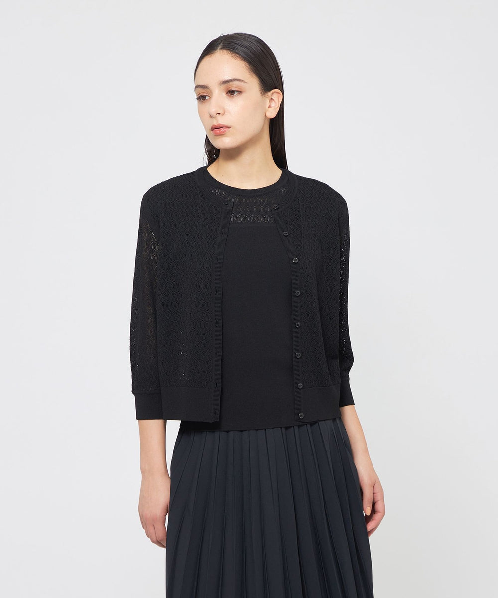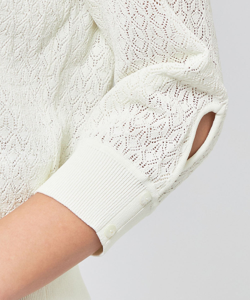 総レース柄のクロップド丈カーディガンです。編地の繊細な表情と、清涼感がポイントです。袖口のスリットもさりげないデザインポイントに。同素材のニットプルオーバー(品番:M5N40566)とアンサンブルでの着用もおすすめです。